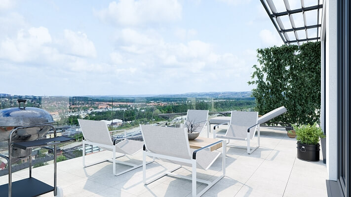 The Záběhlické výhledy project will consist of a modern tiered building located on a slope of the Botič valley in a historic part of Záběhlice. The building is situated on Dolní Chaloupky Lane, which has a peaceful atmosphere that is underscored by the ubiquitous greenery. The residence will offer 8 one-bedroom and two-bedroom apartment units, ranging in size from 58.6 to 101 sq. m. On the ground floor, there will be 10 garage parking spaces. Each apartment has its own south-facing terrace (6.9 to 37.9 sq. m.) as well as a cellar storage unit. The apartments range in price from 6.6 to 11.8 million Czech crowns.