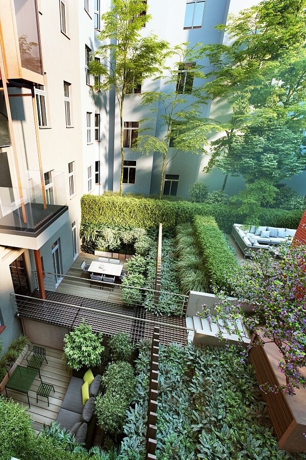 The Orelská 13 residence is located close to architect Josef Gočár’s iconic Functionalist Church of St. Wenceslas on náměstí Svatopluka Čecha square, near the charming Heroldovy sady park. Krymská Street (according to the The New York Times one of the 12 most popular streets in Europe), with its unique cafes, bars, and galleries, is close-by. In the last decade, Vršovice gradually transformed itself into an attractive neighborhood with a vibrant cultural and social scene. The Orelská 13 residential project is also contributing to this trend. Originally built in 1911, the renovated Art Nouveau building includes a courtyard with an abundance of greenery. All of the improvements are based on the best architectural practices from the early 20th century while meeting the demands of contemporary urban living standards and modern interior design.