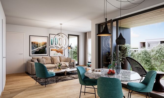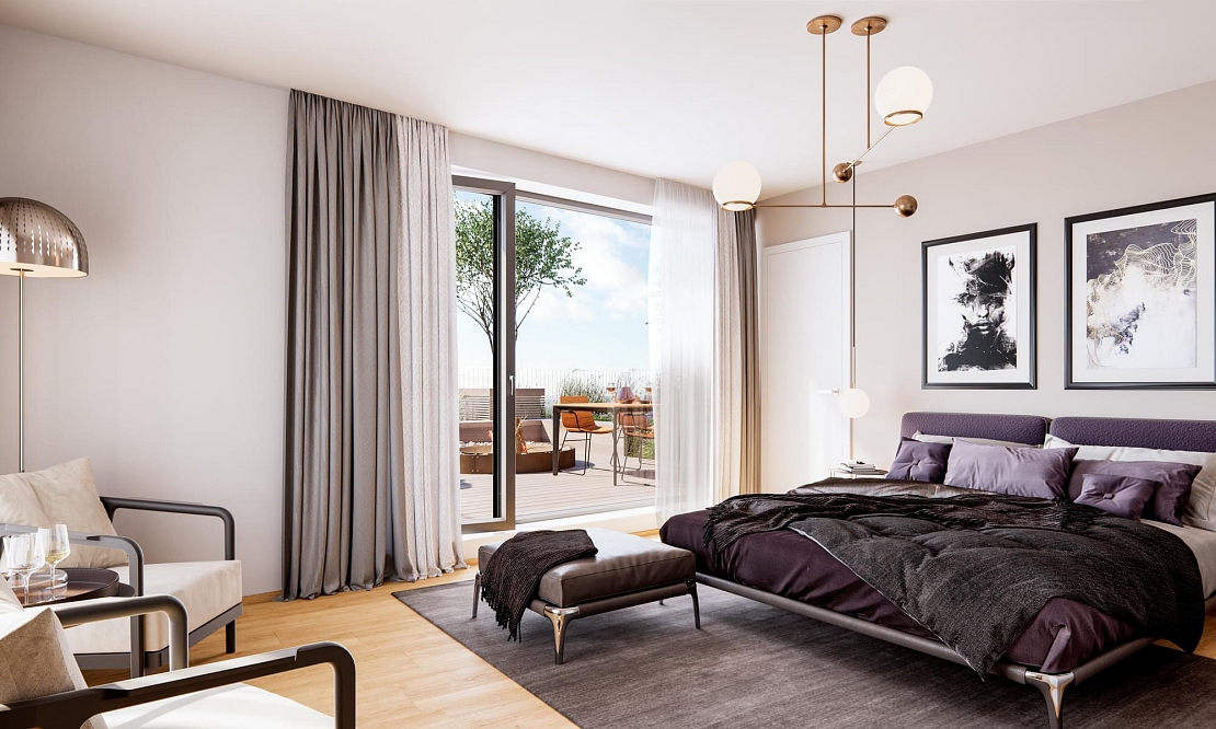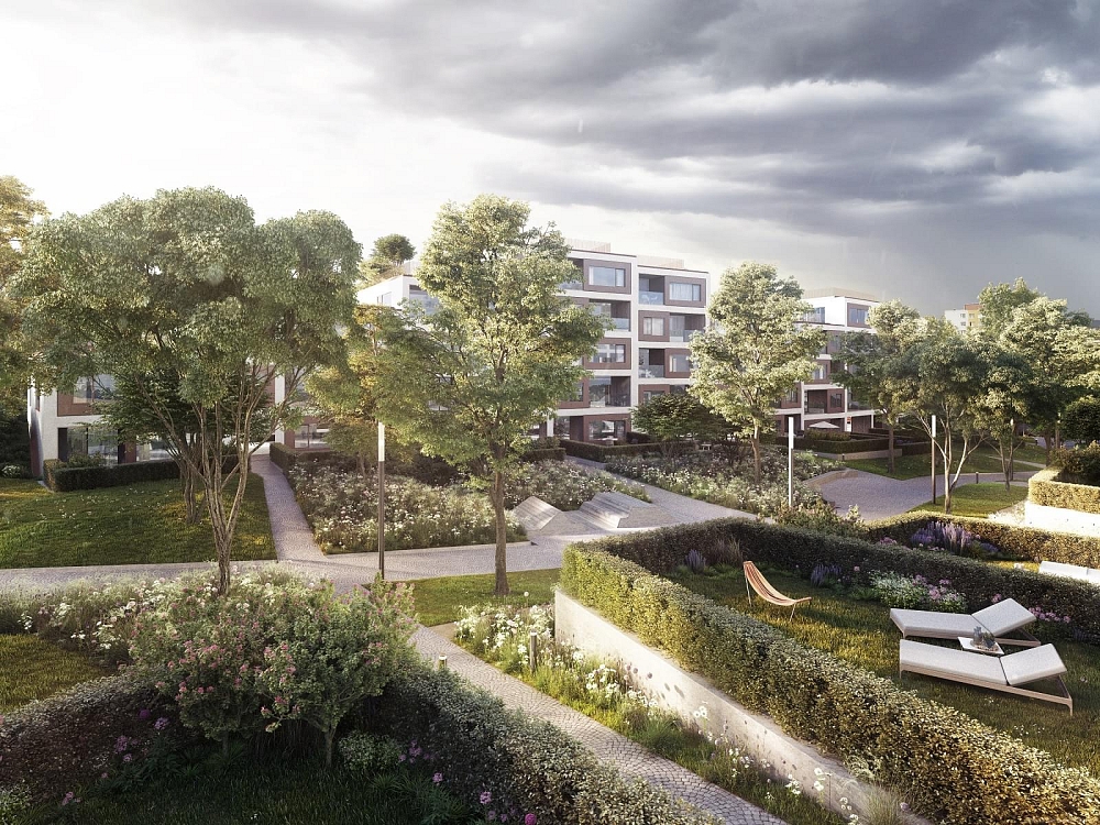 The interior of most apartments will be extended by a balcony, terrace, or front garden, which will look out onto a park that winds between the two apartment houses. The apartments on the highest levels will come with a green rooftop terrace also designed by Atelier Flera. Large-format windows will flood the main living rooms with natural light and frame wonderful green views. The standard of completion also includes three-layer wooden floors available in three decors, wooden plank surfaces in the loggias, and bathrooms with ceramic tiles, large-format tiles, and designer sanitary ware. Each apartment comes with the option of buying a parking space in the underground garage and a cellar storage unit.
