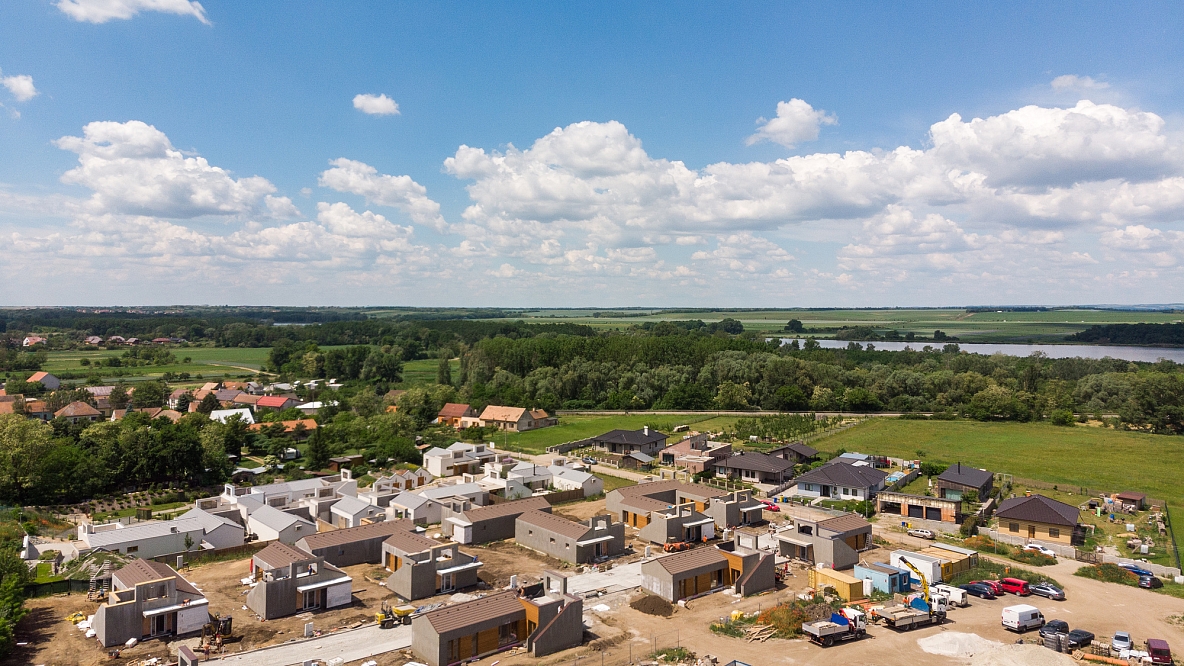 The Pálavská brána residential project is being built as an architecturally compact complex consisting of fifteen single-story houses with private rooftop terraces that offer views of the local vineyards and the Pálava Hills. In June, the access road to the houses was almost completed. At present, the majority of the tiling in the bathrooms is almost finished and sanitary ware is being installed.