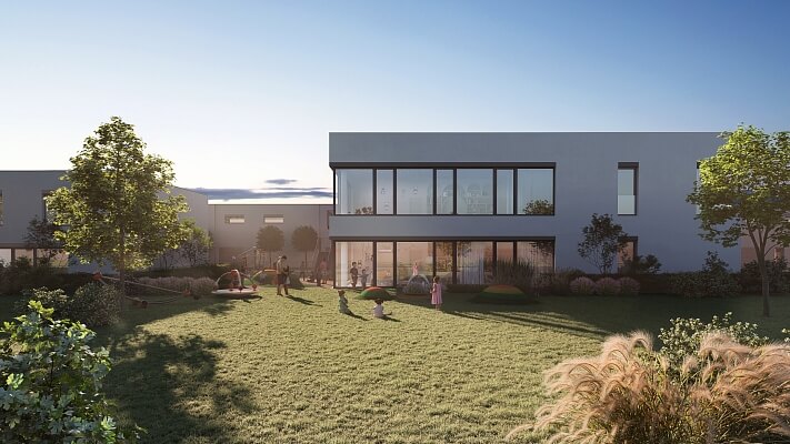 From the very beginning, the goal of the Na Pramenech residential project was to create a unique, gated community concept with a pleasant family atmosphere enhanced by a kindergarten with a playground. Situated by the entrance to the complex, this two-story building with a usable area of 416 sq. m. is surrounded by a 771 sq. m. garden. The kindergarten is being sold in a state of shell and core, i.e., without final surfaces in the interiors.