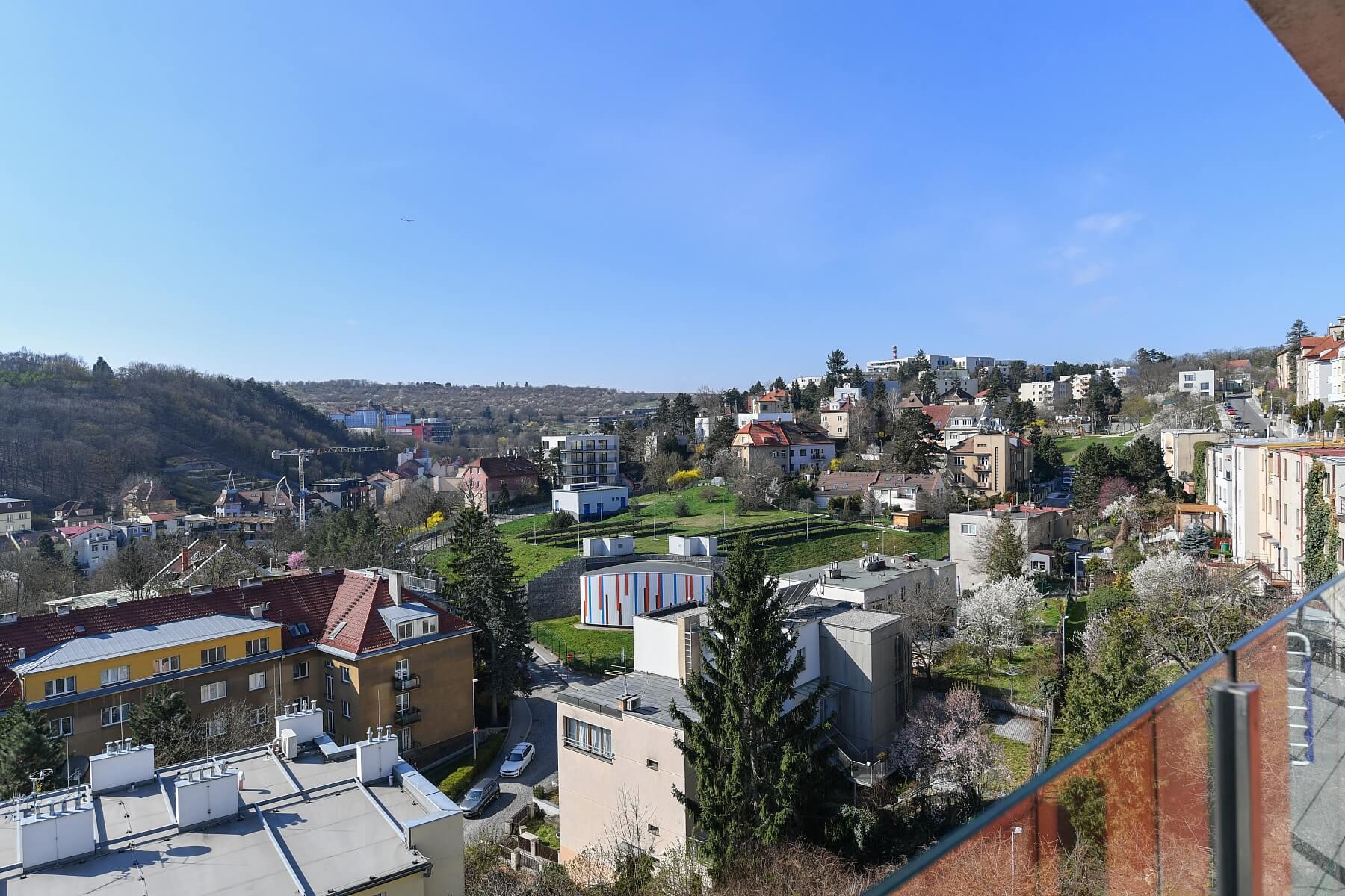 This bright, quality furnished apartment with a south-facing enclosed balcony and beautiful views is situated on the 3rd floor of the modern Aurum Residence, set on a slope on a quiet street in Malvazinky, Prague 5, in close vicinity of the Paví Vrch, Na Pláni, Na Farkáně, and Santoška parks and located within easy reach of the Radlická metro station, with bus and tram connections and quick access to full amenities, the Nový Smíchov/Anděl shopping zone, and sports facilities including a swimming pool, a fitness center, tennis courts, and more.