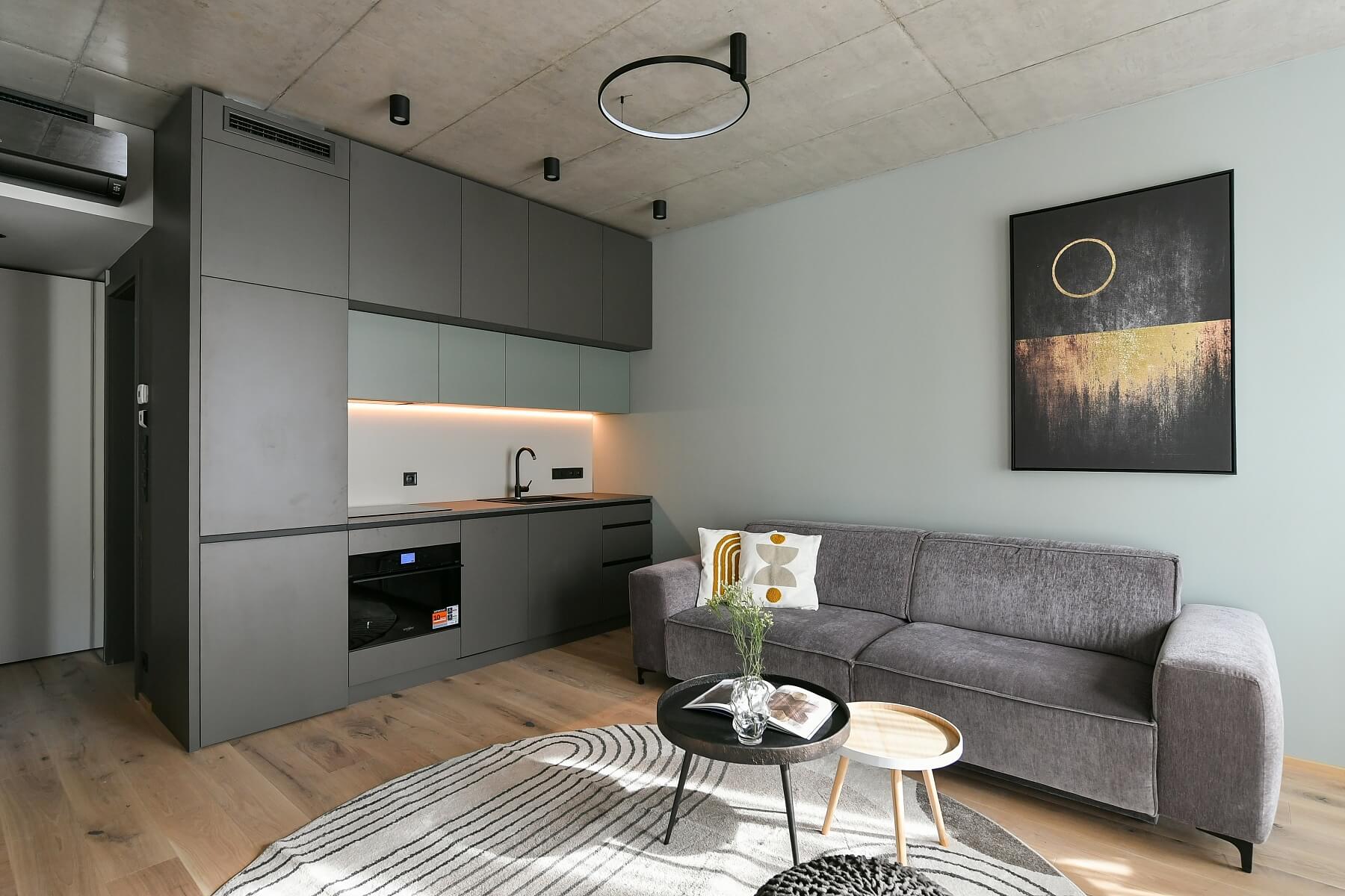 This is a brand new fully furnished 1-bedroom apartment on the third floor in the Block Karlín Living residential project with a shared roof terrace, underground parking and a quiet landscaped courtyard. The 7-story building was designed by the renowned Architekti Headhand architectural studio. Located in the popular neighborhood of Karlín, within walking distance of the Invalidovna and Křižíkova metro stations and close to a tram stop. A trendy location with fast connections to the city center offering complete amenities and services. The immediate surroundings consist of a number of modern business and administrative centers as well as a traditional urban development with a cosmopolitan mix of restaurants, cafes, bistros, and shops. The district offers a wide range of opportunities for active pursuits such as tennis courts, golf driving ranges, a bike path, and a number of fitness centers.