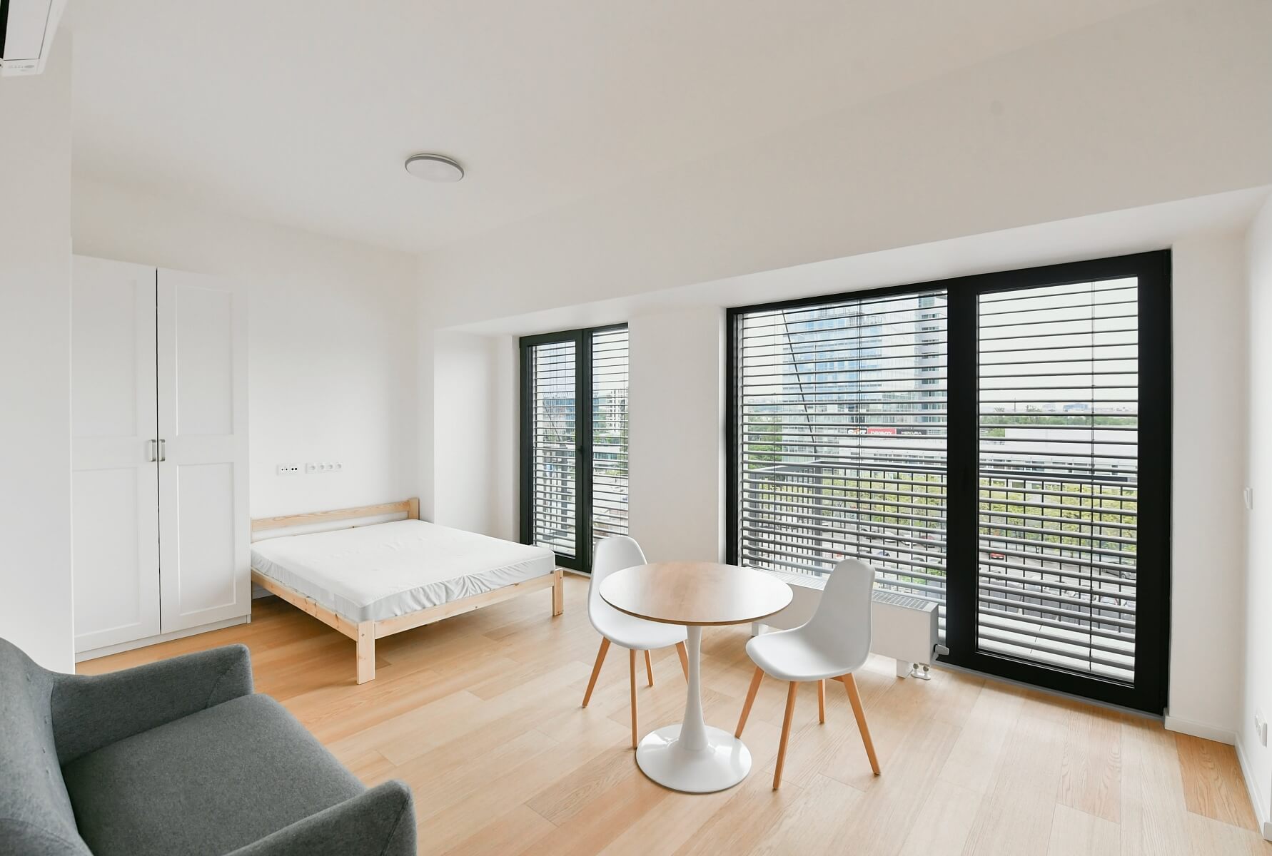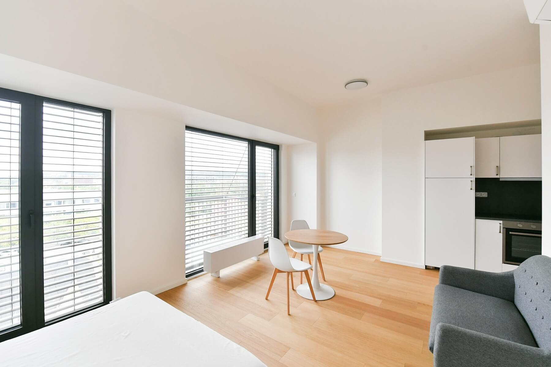 This furnished studio apartment with a balcony is on the 5th floor of the recently built SO-HO Residence in close vicinity of the Vltava embankment and Ladislavův Park. Situated on a quiet street in Holešovice, Prague 7, in a location with full amenities within easy reach and excellent access to the city center—tram connections to the the Palmovka, Vltavská, and Nádraží Holešovice metro stations. Conveniently located for the Holešovice Squash Center, the Rohanský Ostrov driving range, the DOX Centre for Contemporary Art, the Prague Market, and many theaters and music clubs incl. SaSaZu, La Fabrika, Rock Opera, and Jatka 78.