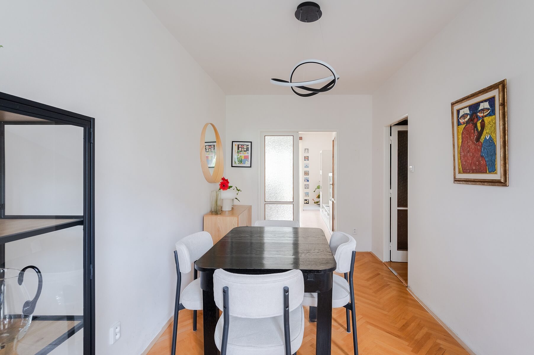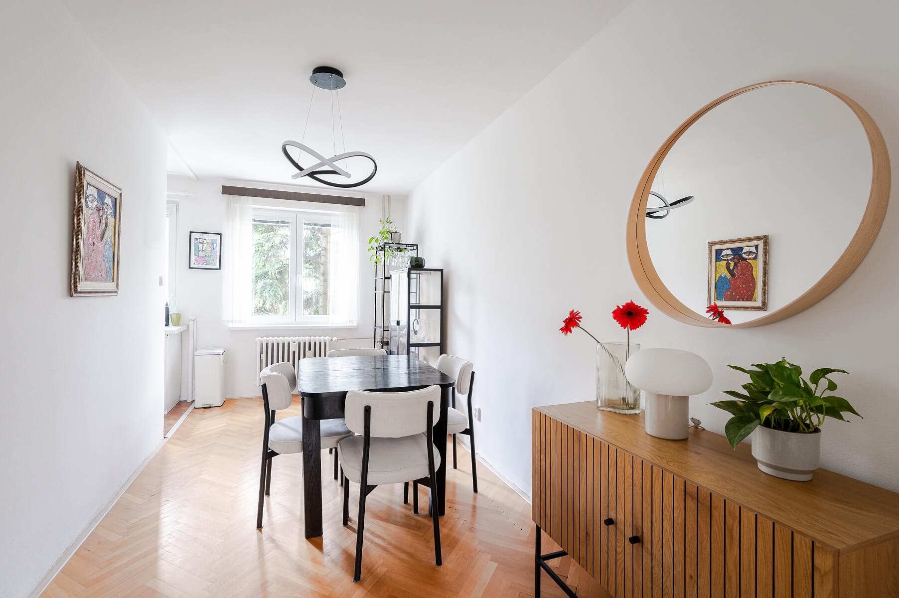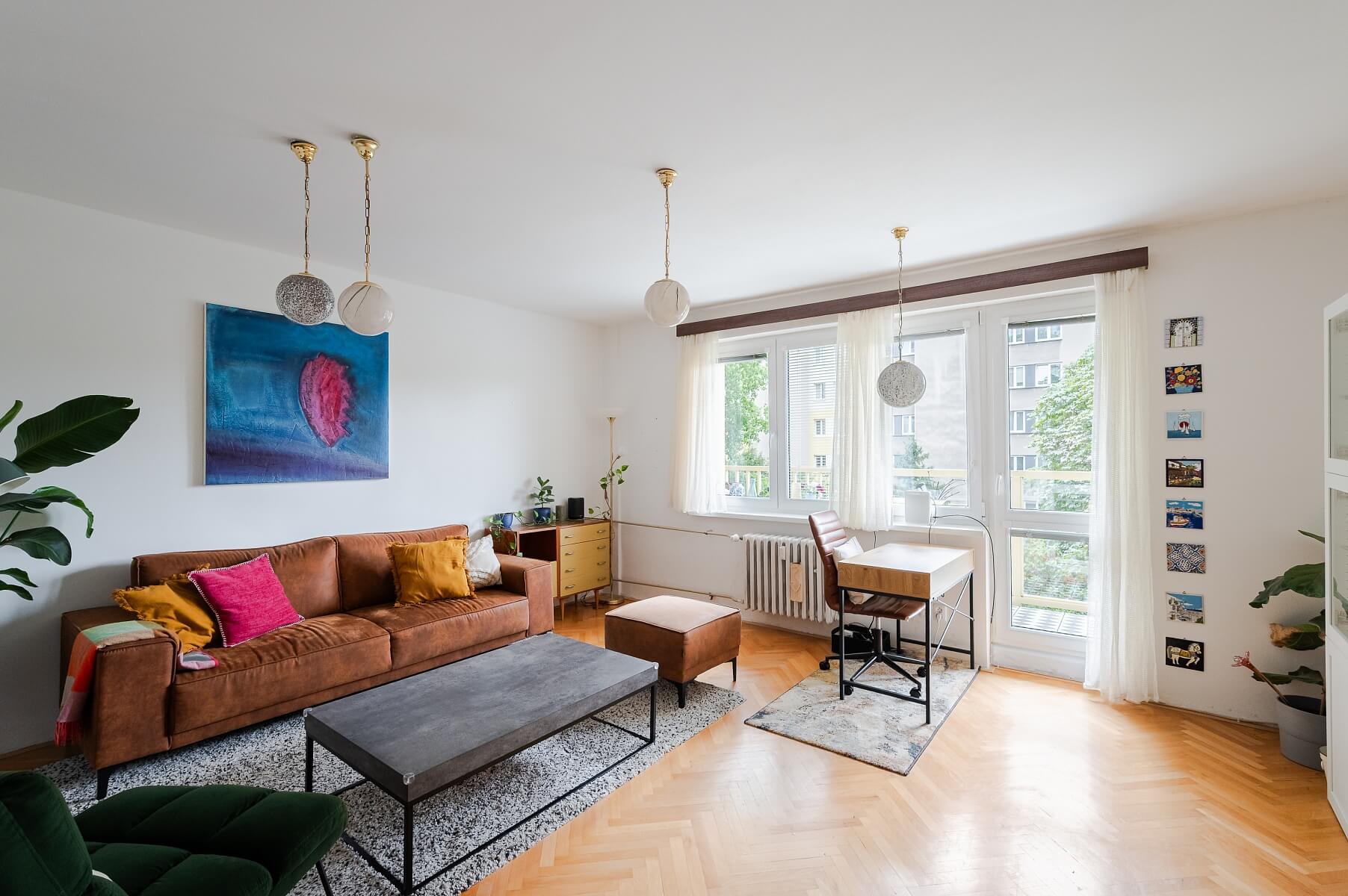 This semi-furnished 2-bedroom apartment with an enclosed balcony is on the 3rd floor of a panel residential building with an elevator in Záběhlice, Prague 4. Located not far from the Roztyly metro station and Westfield Chodov shopping mall, near a bus stop with connections to the Kačerov and Skalka metro stations, within easy reach of good amenities and services, with several playgrounds in the area. The nearby nature park with the Hamerský Pond and the Kunratický forest with an eight-kilometer hiking/jogging trail provide much-needed fresh air and greenery.