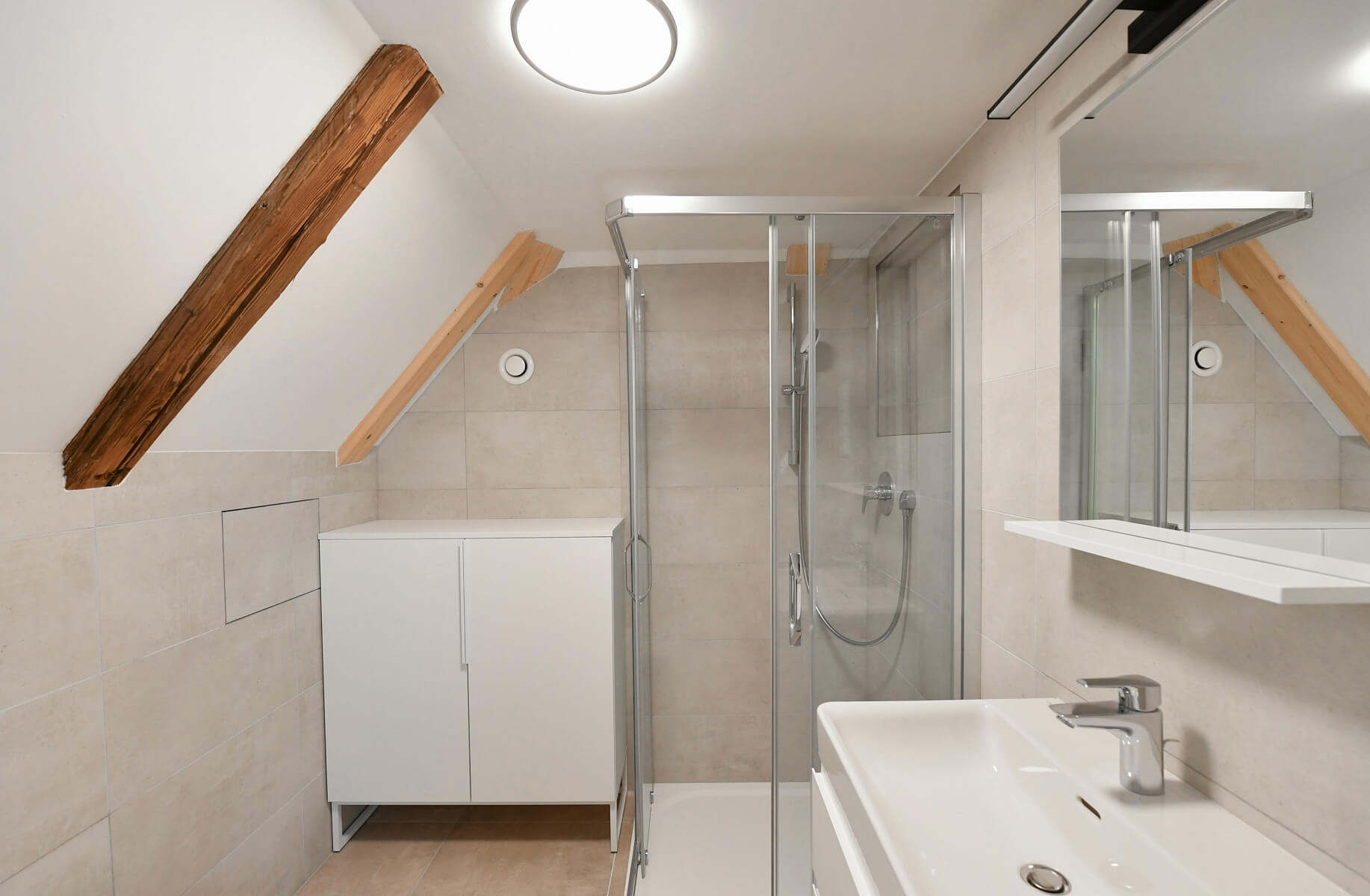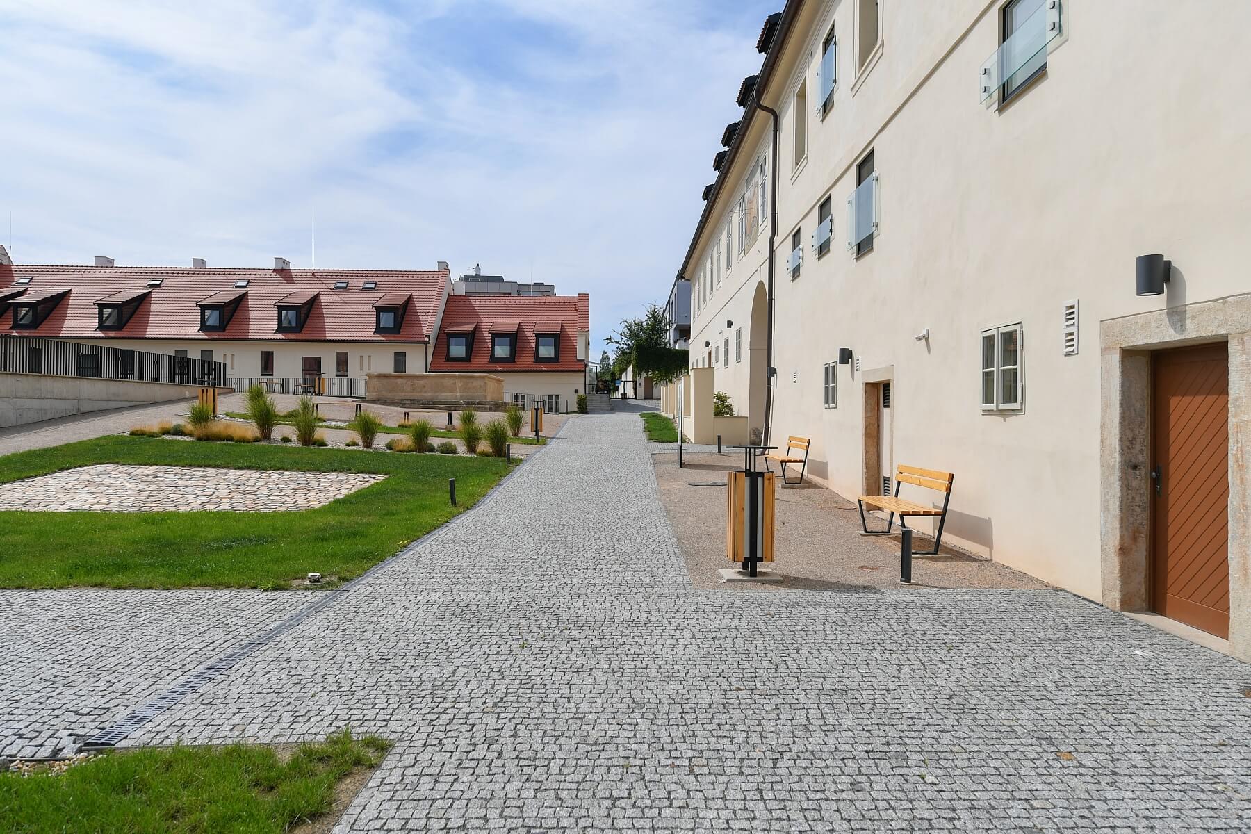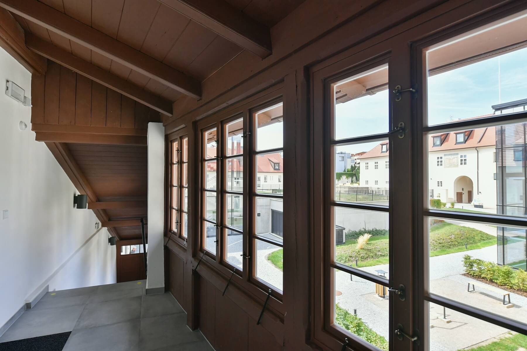 This brand-new furnished air-conditioned 2-bedroom 2-bathroom split-level apartment is on the 2nd topmost floor of the Jinonický dvůr Residence - a completely modernized gated residential complex with preserved original architectural features, a landscaped courtyard with relaxation points, and a historic fountain. Set in a quiet residential neighborhood surrounded by greenery, on the edge of the Vidoule natural protected area, near two local ponds, and just moments from the German School. Near by are several playgrounds and numerous sports facilities including a winter stadium and a skatepark. The Nové Butovice metro station and shopping mall are within walking distance (5-10 minutes), and there is an easy connection to the city center and Anděl business and entertainment zone.