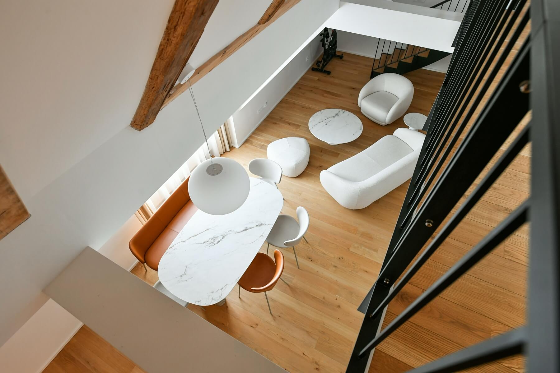 The lower level of the apartment features a living room with a fully fitted open plan kitchen, a bedroom with a fitted walk-in closet, and a bathroom (bathtub, toilet). The upper floor includes a large open gallery/bedroom, and a second bathroom (walk-in shower, toilet).
