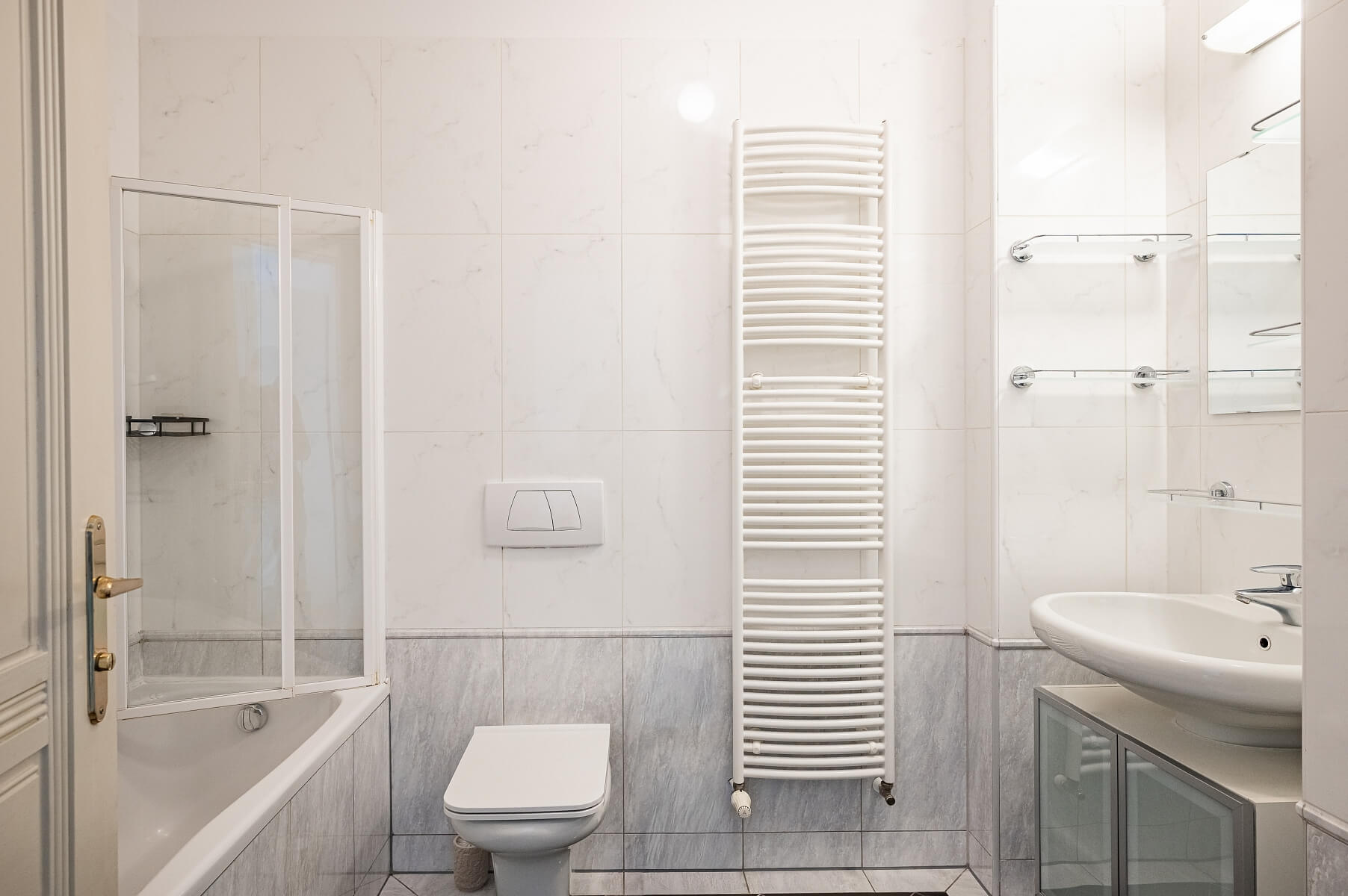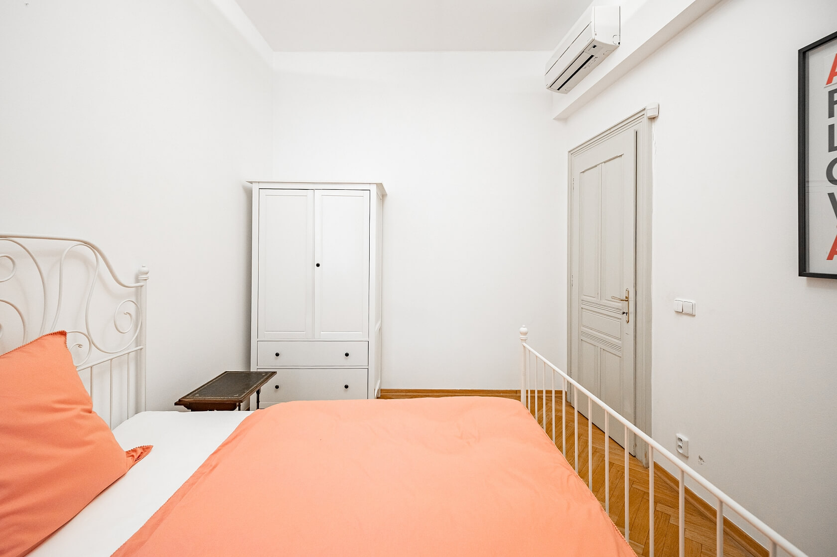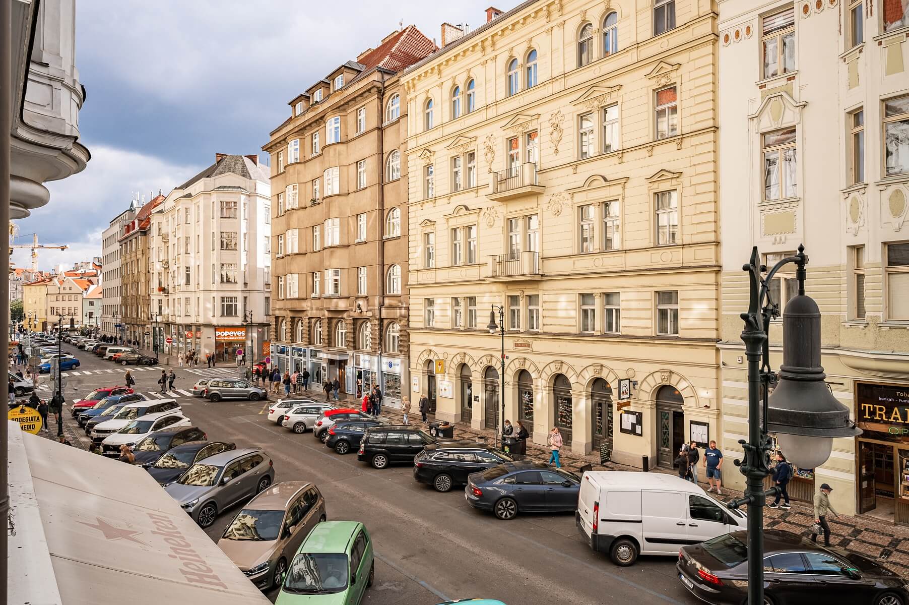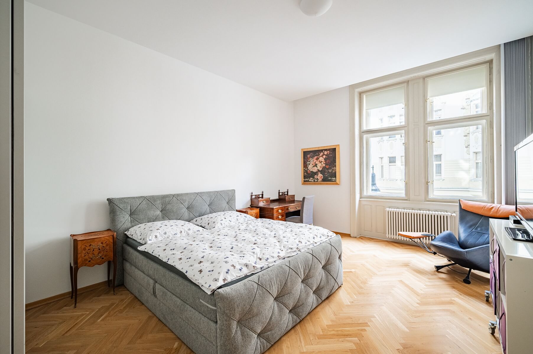 This furnished air-conditioned 2-bathroom apartment is on the 1st floor of a classic late 1900s apartment building listed by UNESCO, fully renovated with top-quality materials, finely finished, and a must-see, meticulously restored original elevator with wood inlay, beveled and etched glass, and ornate ironwork. Centrally located across from the metro station in Old Town and several tram lines, two blocks from Old Town Square, one block from the Vltava riverbank, near the Four Seasons Hotel and Rudolfinum concert hall, and within walking distance of major historic sights in Prague. Building amenities include a 24-hour reception.