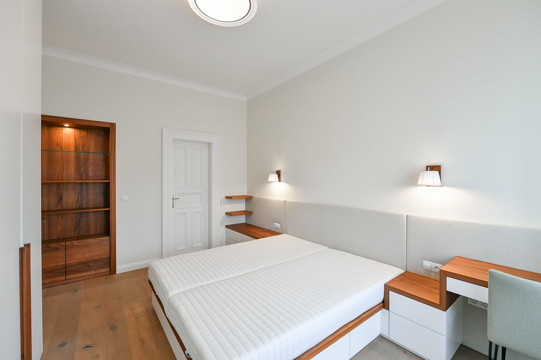 This fully refurbished, semi-furnished air-conditioned 2-bedroom apartment with a balcony is on the 4th floor of a completely renovated apartment building with an elevator, set on a quiet street mere steps from Stromovka Park, the largest park in Prague, a 15 min. walk to the city center through another popular Prague park - Letná, and not far from Prague Castle. This highly sought-after location offers complete amenities and very quick access to the city center - a tram stop is one minute from the building and it's only a few stops to the Hradčanská (line A) and Vltavská (line C) metro stations. Conveniently located for the airport and numerous international schools.