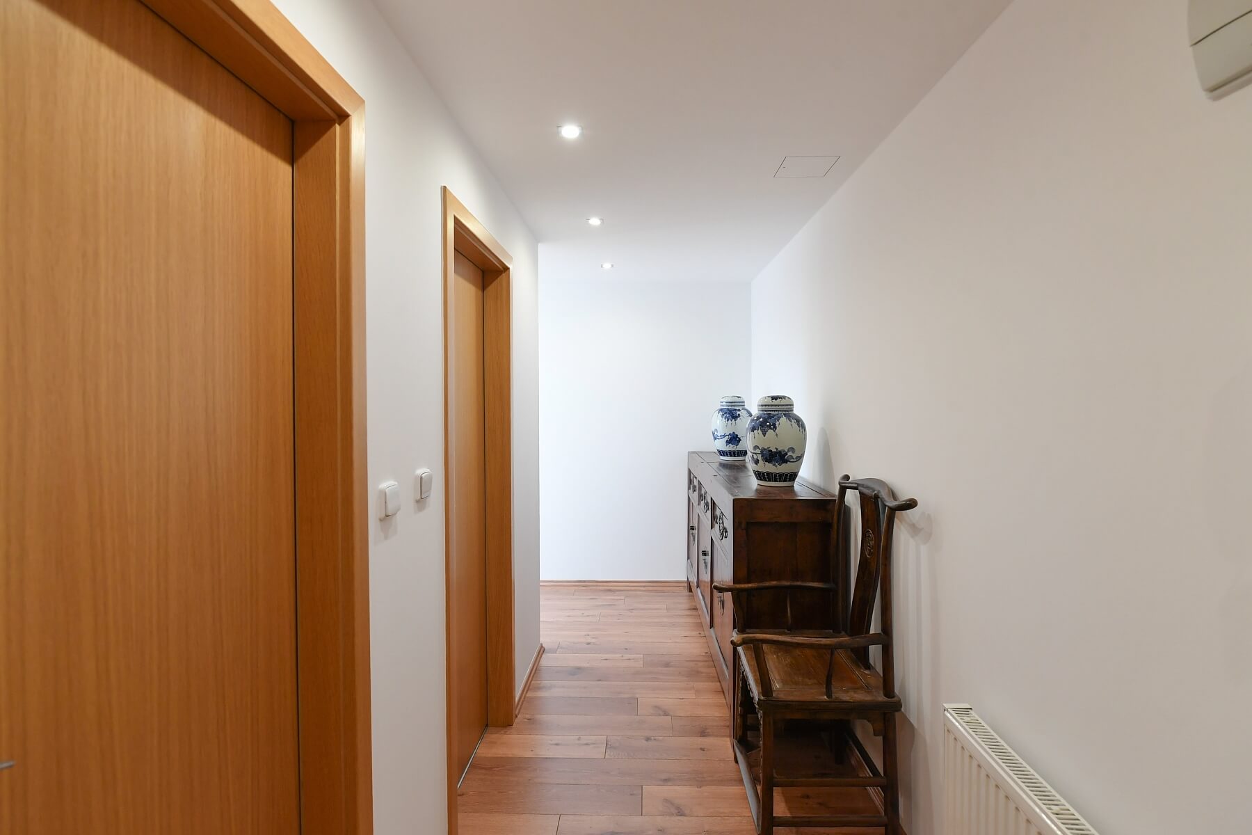 Air-conditioning, laminate floors, tiles, roller blinds, central heating, washing machine, induction stove top, microwave oven, chip entry to the building, cellar.
