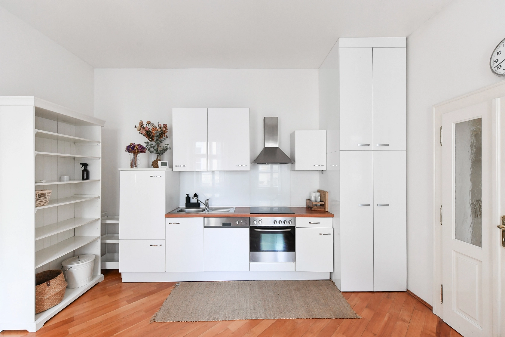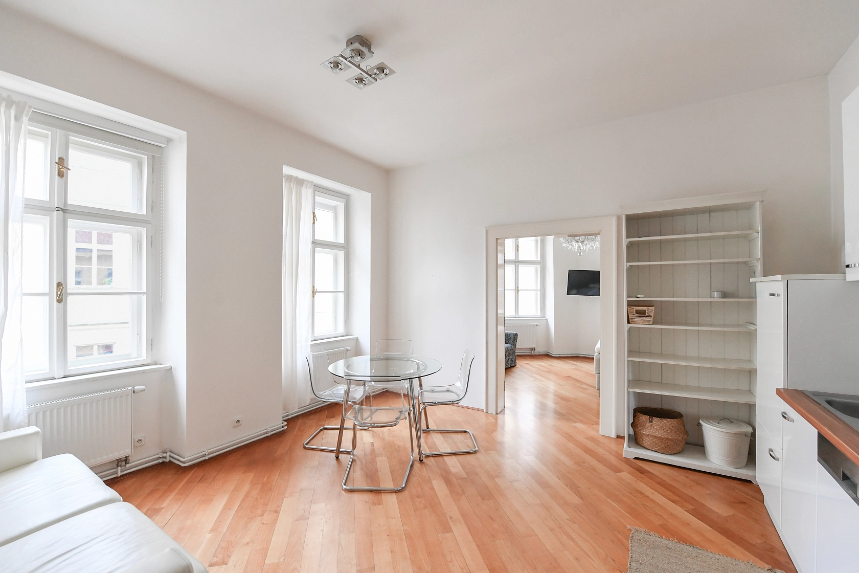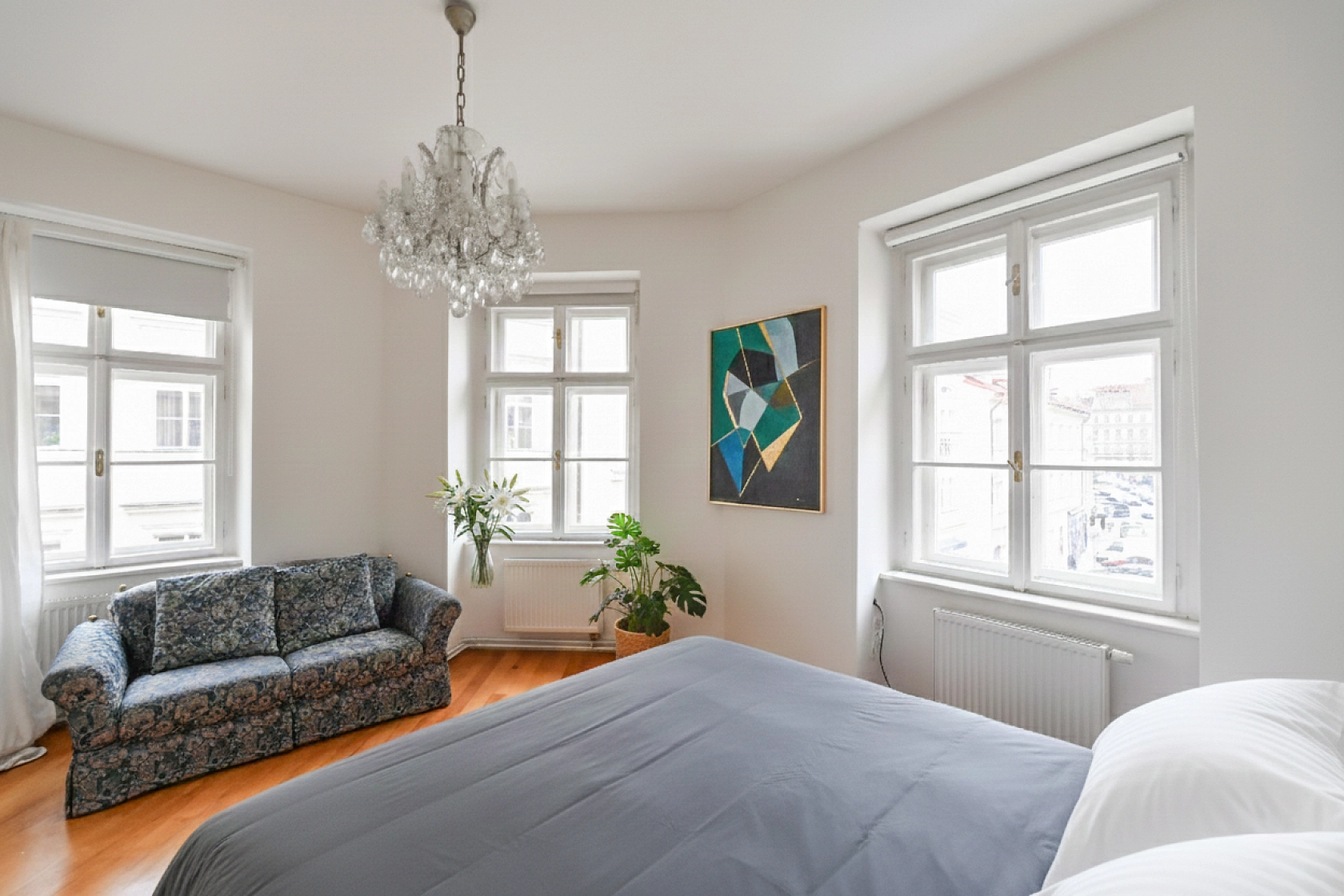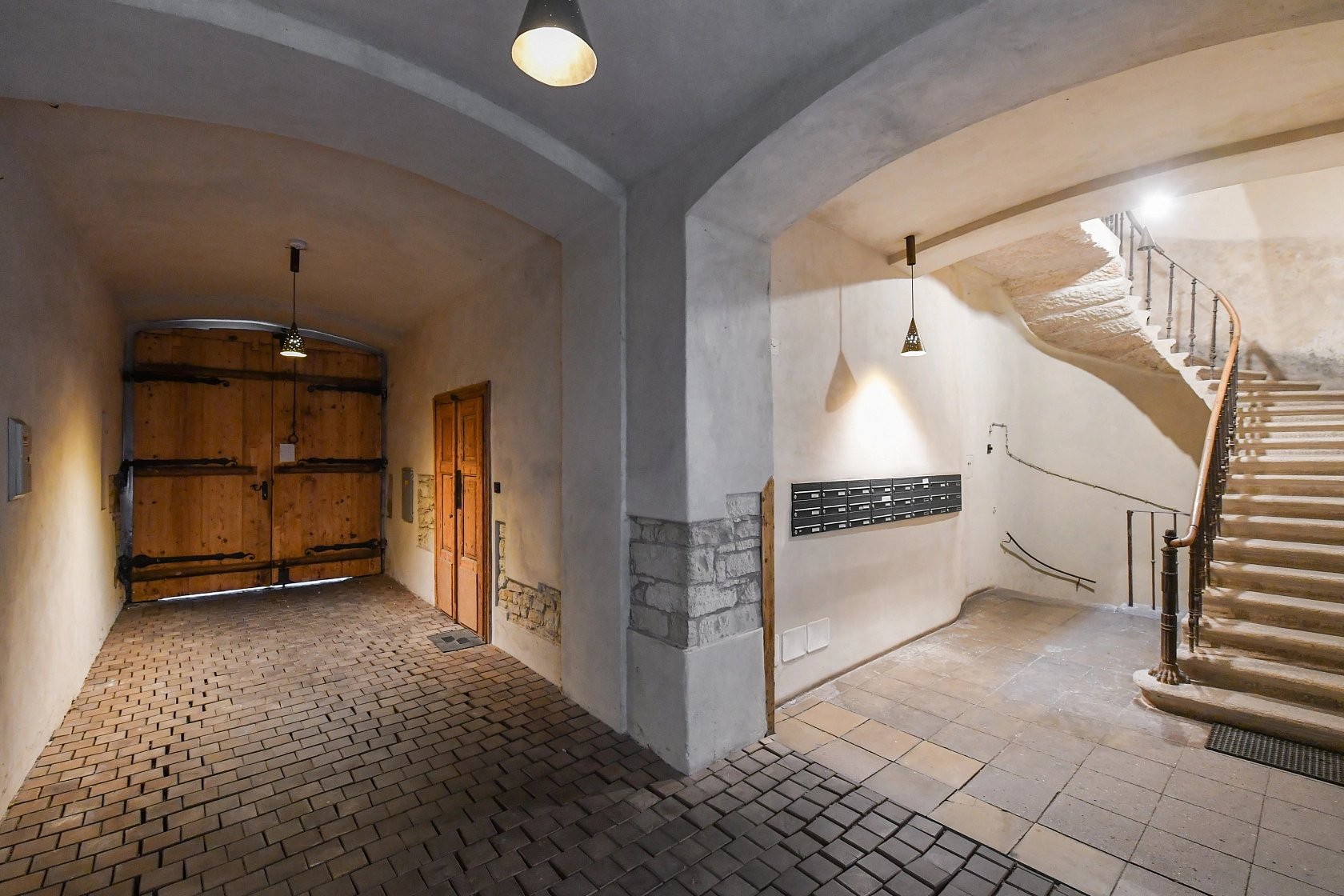 This fully renovated, completely furnished 1-bedroom apartment offering pretty views of the Haštalské Square is on the second topmost floor of a completely refurbished, charming historic building with beautifully preserved original details. The building's renovation was done under the guidance of renowned Czech architects. Located in a quiet street in the very center of historic Prague, in the immediate vicinity of the Convent of St. Agnes, in a prestigious area close to the Vltava embankment, Old Town Square, and luxurious Pařížská Street, with full amenities near by and within walking distance of the Náměstí Republiky and Staroměstská metro stations.
