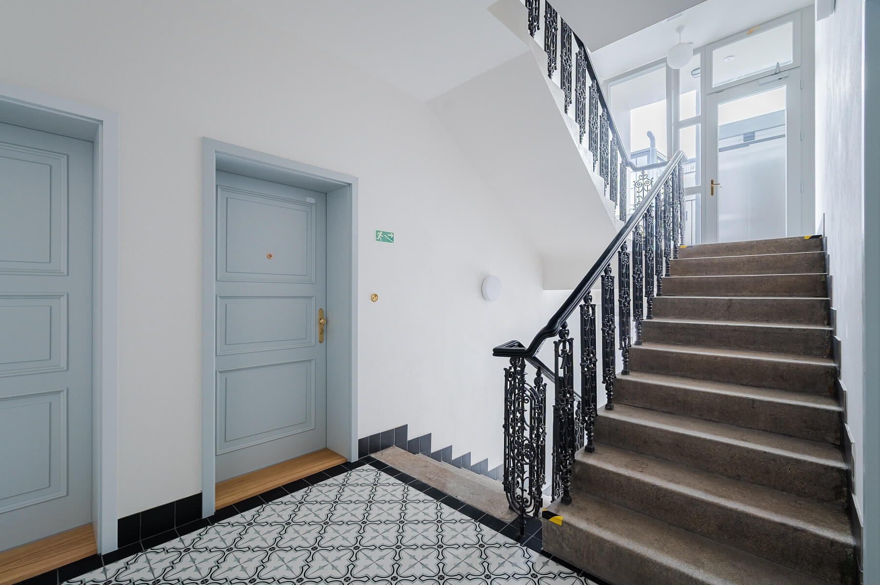 Vinyl floors, La Ceramica Trust floor and wall tiles, historic-style panelled interior and entrance doors, Grohe bathroom fixtures, dishwasher, central heating, cellar. Unlike in the photos, the apartment will be equipped with furniture. Short term rental is available.