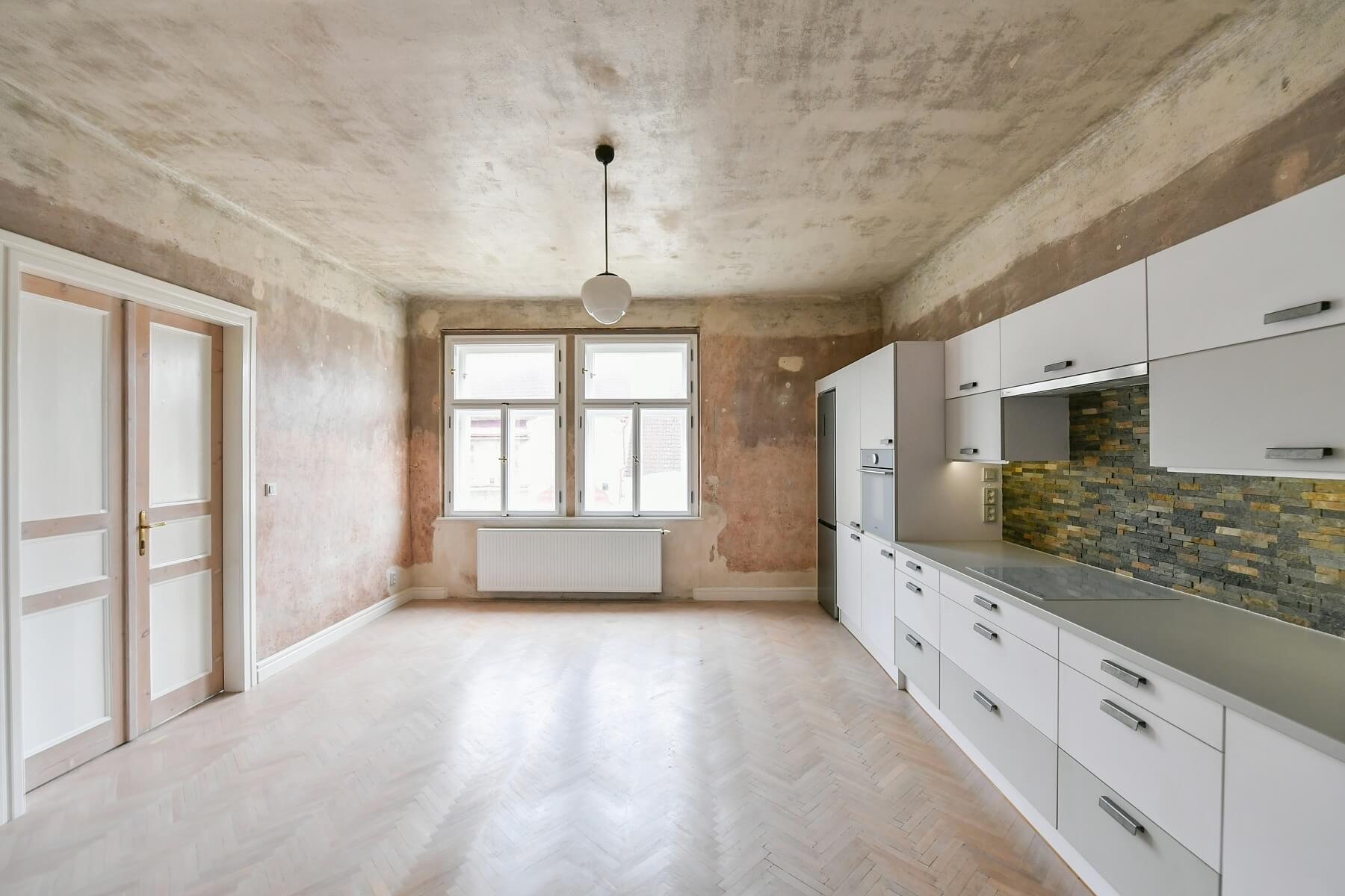 This bright, partially refurbished unfurnished 2-bedroom apartment is on the 4th floor of a well-maintained renovated Art Nouveau building with no elevator. Located in the attractive residential neighborhood of Vinohrady, on a quiet street mere steps from lovely Riegrovy Sady Park and just two blocks from Jiřího z Poděbrad Square with a metro station, tram stop, regular farmers' market, and many quality cafes, bistros, and restaurants. A location with very quick access to the city center and full amenities, within walking distance of the Atrium Flora shopping mall.