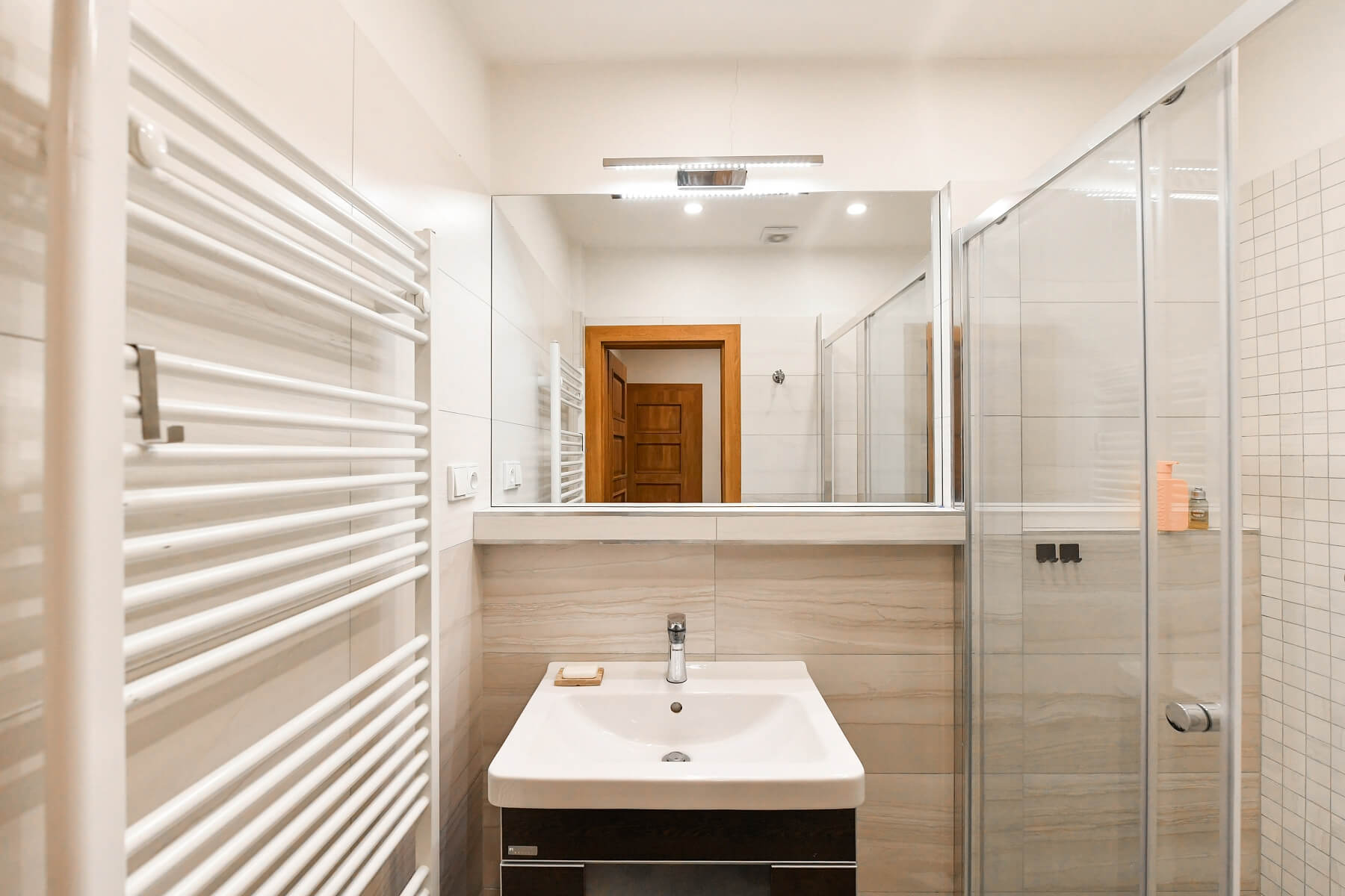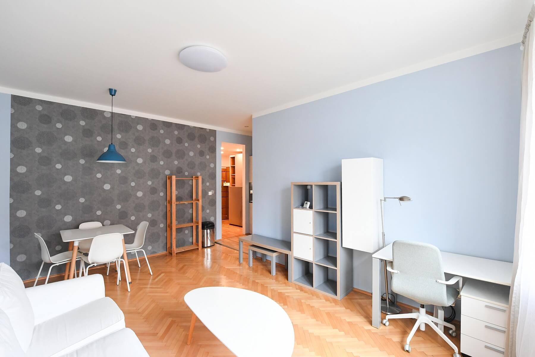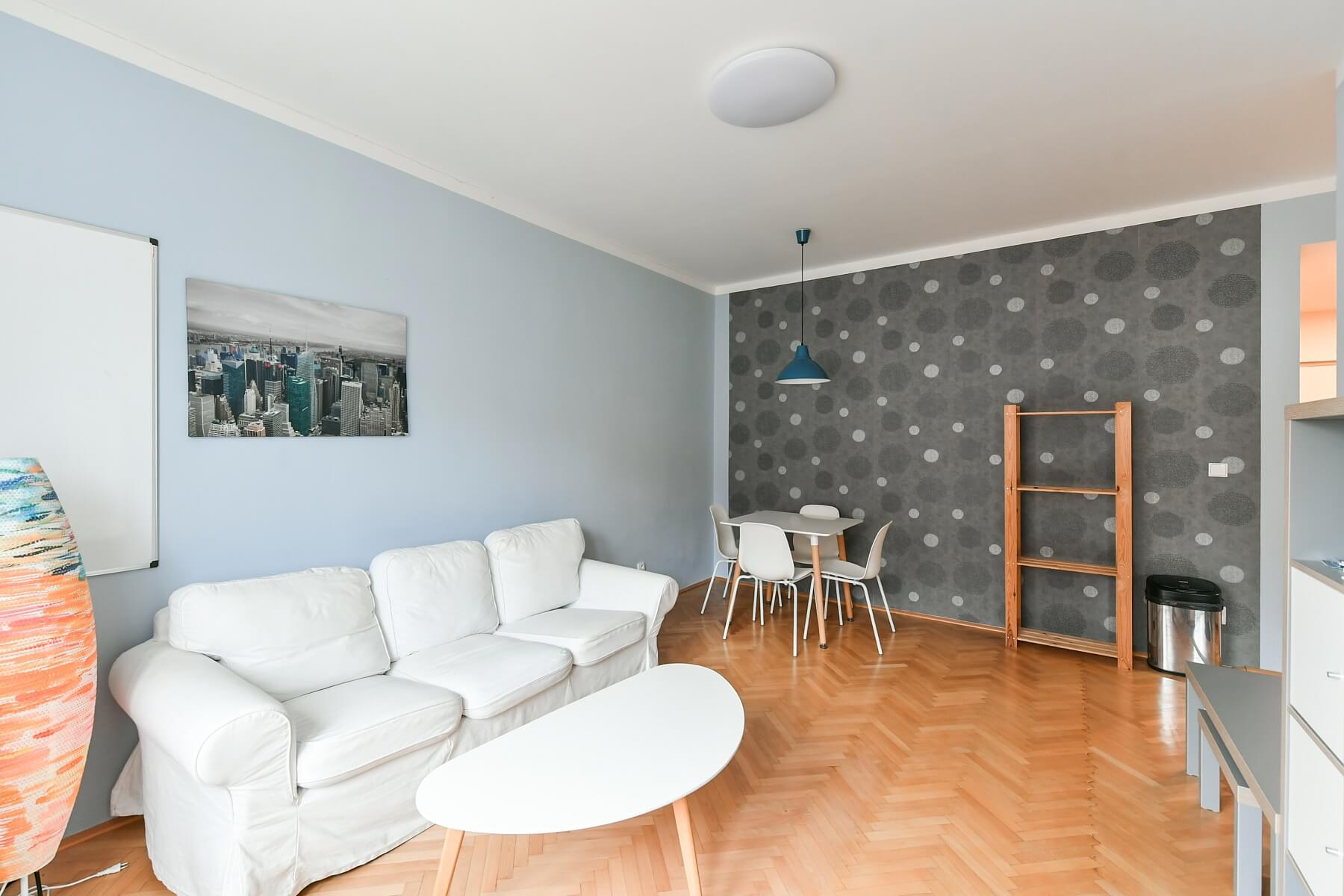 This refurbished fully furnished 1-bedroom apartment is on the 3rd floor of a renovated residential building with an elevator. Situated on a quiet street in Žižkov, Prague 3, near the popular Parukářka and Vrch Vítkov parks and the Pražačka sports grounds, with quick access to the city center and full amenities. A location with bus and tram connections, a few tram stops from Želivského metro station and Flora shopping mall. The popular Aero art house cinema is just a few blocks from the building.
