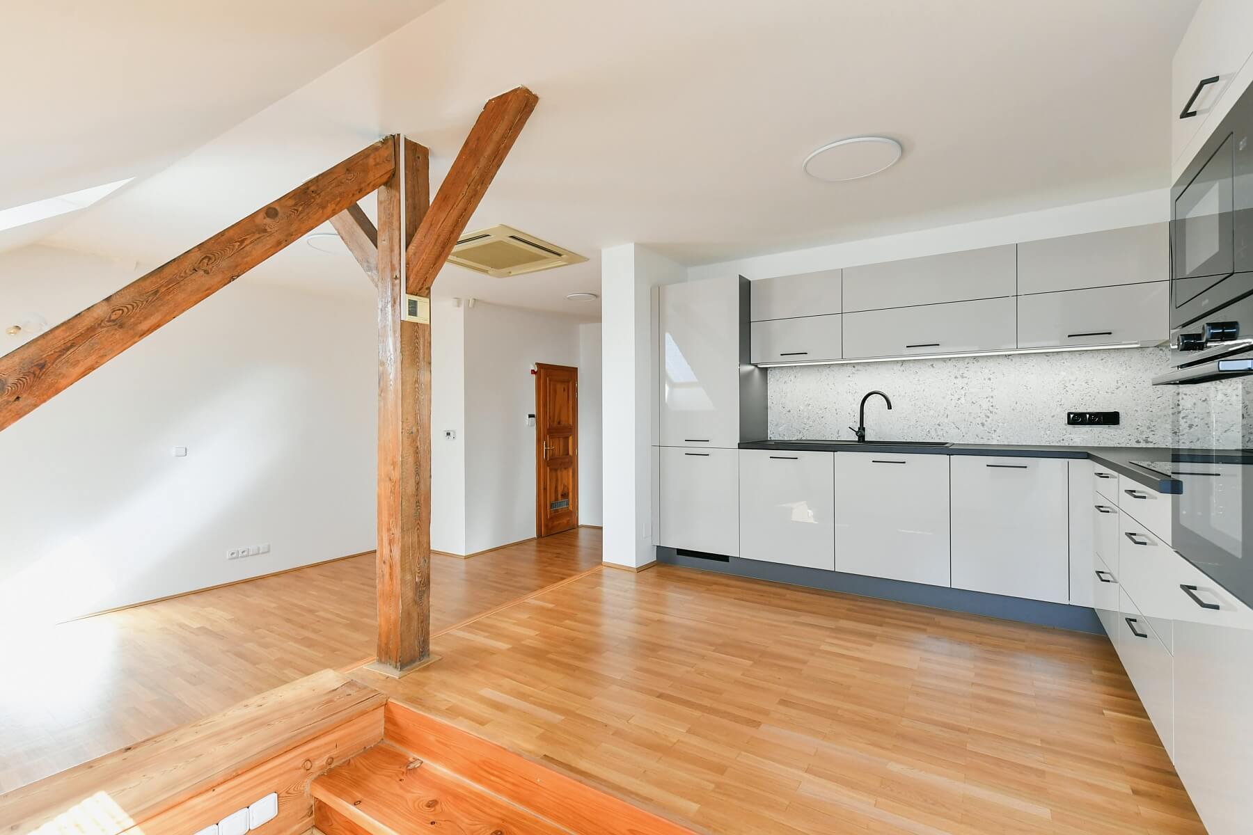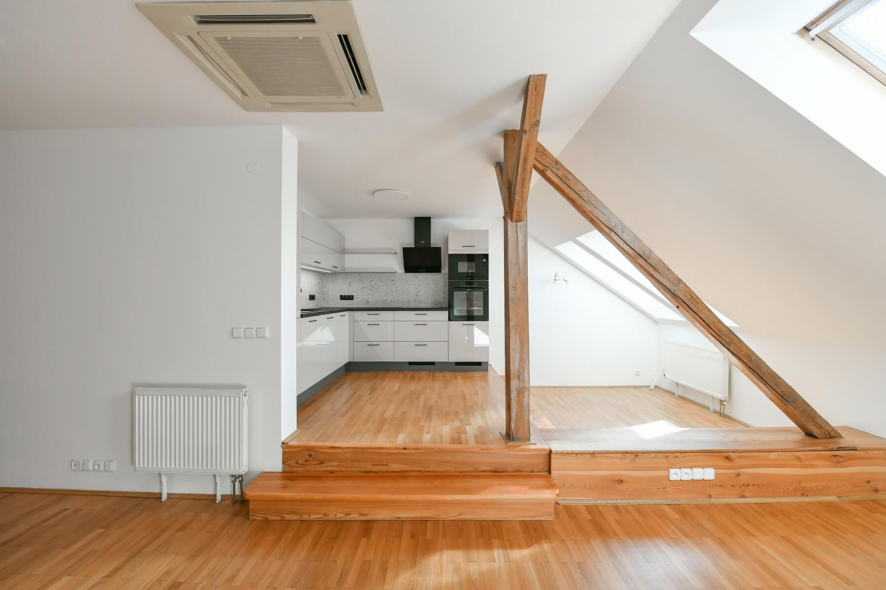 This unfurnished air-conditioned 1-bedroom attic apartment is situated on the 4th floor of a traditional residential building with an elevator. Located in a residential neighborhood in Nusle, moments from Náměstí Bratří Synků Square with tram stops and full amenities and services within easy reach. Conveniently located for the Arkády Pankrác shopping center, Pankrác business center, Jezerka Park, and Divadlo Na Fidlovačce Theater, just a short drive to the city center.