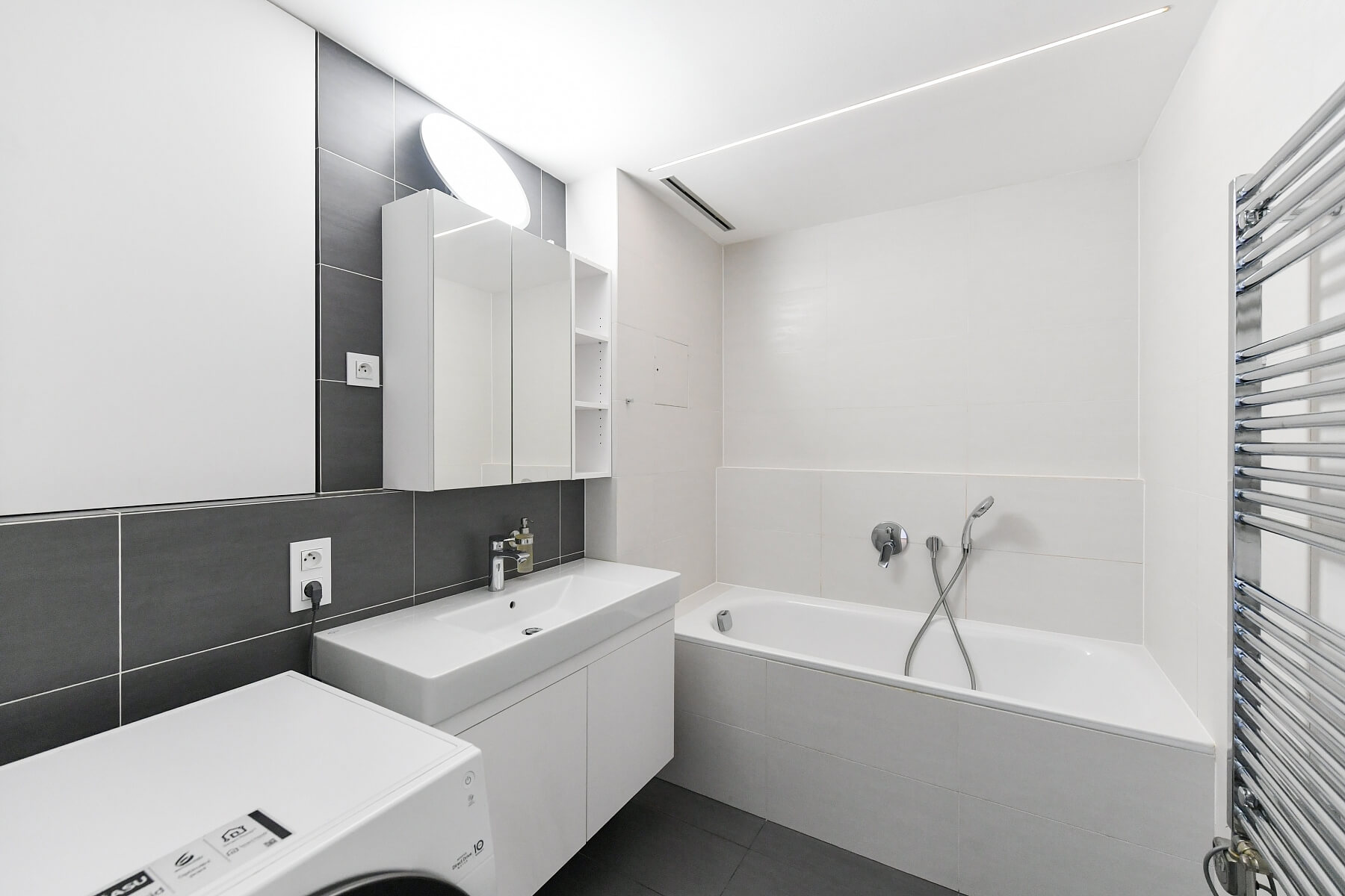 Hardwood floors, tiles, security entry door, French windows, automatic exterior blinds, central heating, underfloor heating in the bathroom, washer/dryer, dishwasher, induction hob, microwave oven, video entry phone, cellar, chip card entry, camera system. A garage parking space is included.