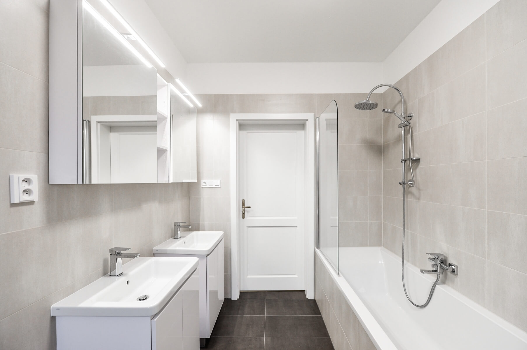 The interior consists of a living room with fully equipped kitchen, 2 bedrooms, a large bathroom with windows, bathtub, two sinks and toilet, and an entrance hall with space for built-in wardrobes.