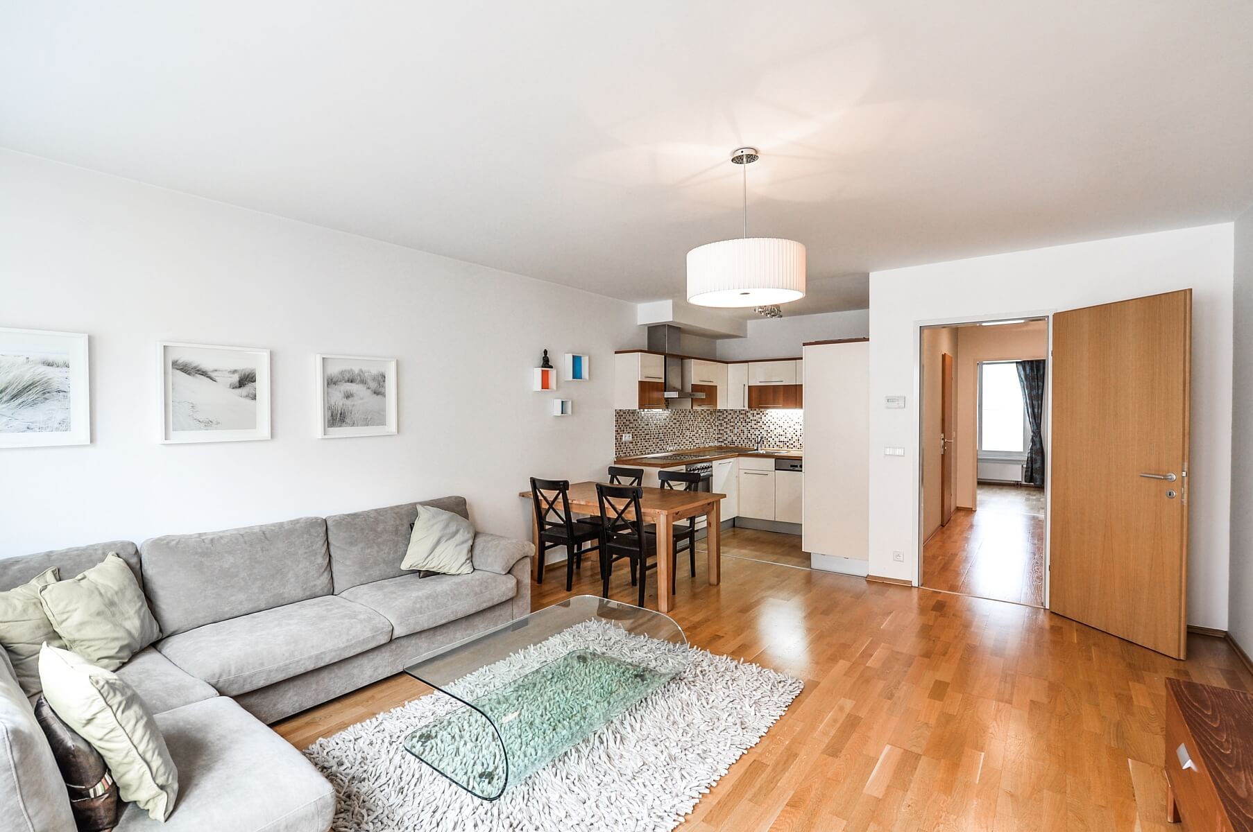 Furnished 1-bedroom flat on the second floor of a modern residence with security cameras and underground parking. Conveniently located near a significant shopping center with sports and cultural facilities. Quick access to the city center, great public transportation connections, a few minutes' walk to the Anděl metro station and multiple bus and tram links.