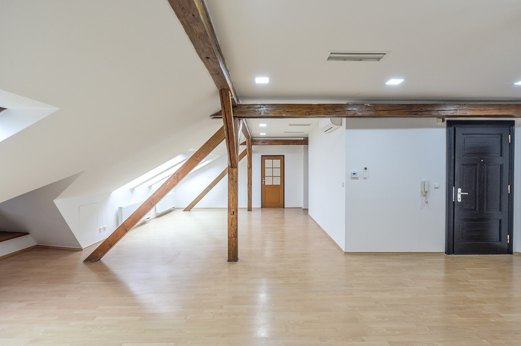 Attic apartment in a unique Neo-Renaissance building, part of the so called "Hlávka buildings" from 1887-98, built by a renown Czech architect Josef Fanta for a prominent Czech philantropist Josef Hlávka. This reconstructed 3-bedroom attic flat with preserved original details is situated on the fifth floor of a renovated historic palace with gables, rich sgraffito decorations and grand interior. Located in a prime central area with full amenities and instant access to metro and multiple tram links.