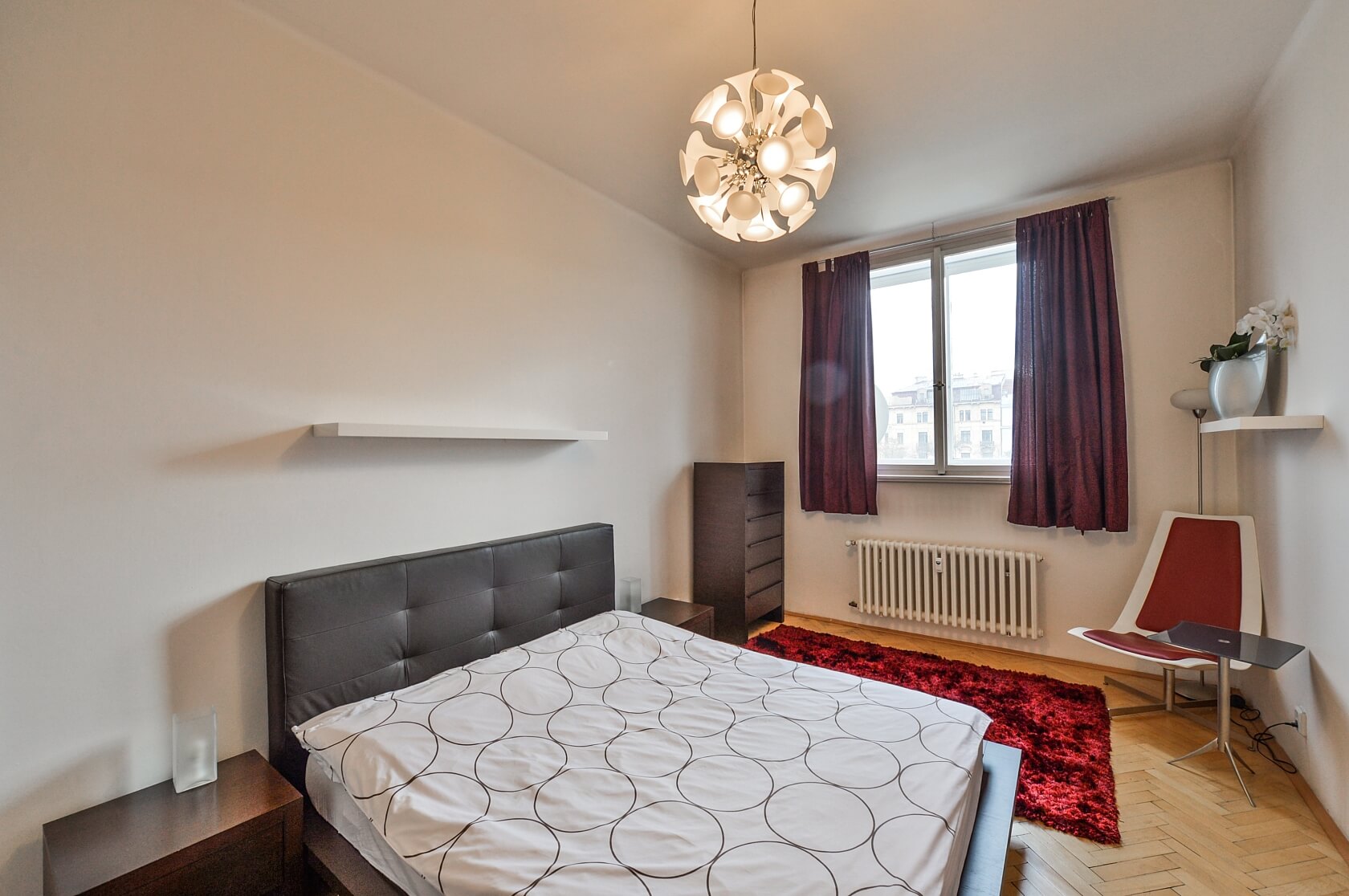 High ceilings, solid wood parquet floors, tiles, security entry door, built-in storage, central heating, washer, dishwasher, fan and microwave ovens, TV. Monthly payment for common building charges, heating and water CZK 5000 per month. Electricity will be transferred to the tenant.