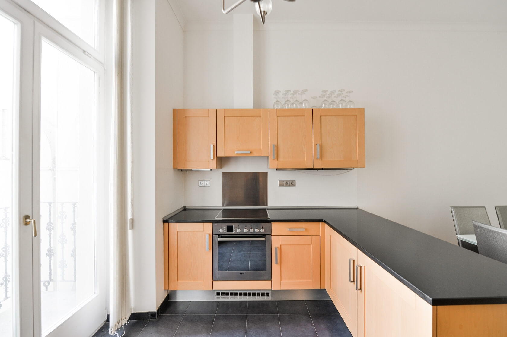 High ceilings, large windows, solid wood parquet floors, tiles, gas boiler, washing machine, dishwasher, video entry phone, alarm. Parking is available in the nearby Rudolfinum public garage. Service charges and utilities are billed separately.