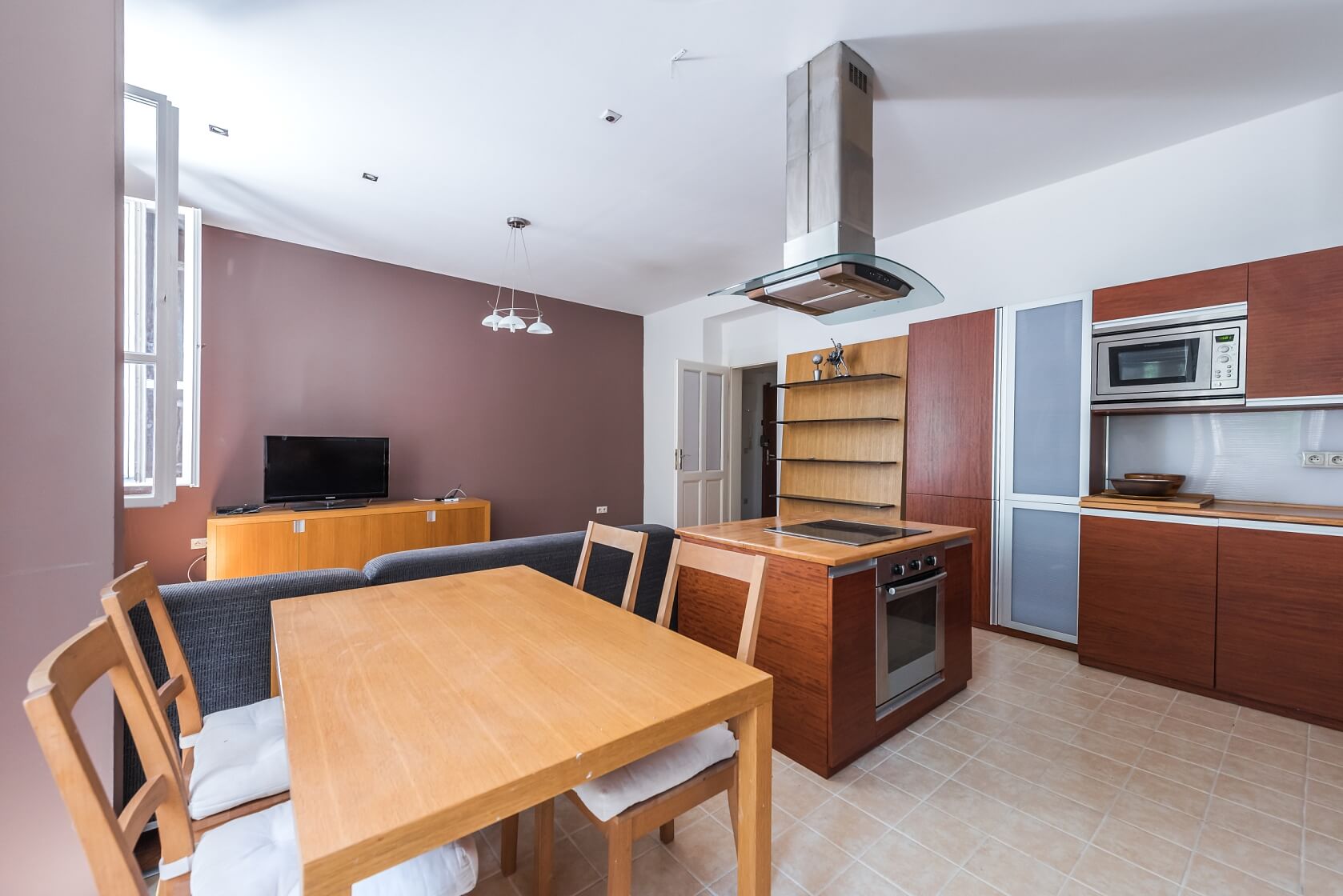 Spacious airy rooms, preserved original details, high ceilings, large windows, solid wood parquet floors, tiles, security entry door, gas boiler, washer, dishwasher, microwave oven, TV, cellar, balcony on the mezzanine floor of the building. No lift. Service charges and water bills: approx. CZK 1200/month for 2 persons. Gas and electricity are billed separately.