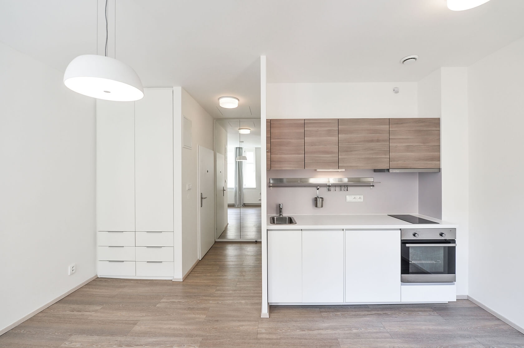 Reconstructed top floor unfurnished studio on the 1st floor of a building with a lift in a quiet tree lined street on the border of Vinohrady and Žižkov with quick connection to the city center. Jiřího z Poděbrad metro station and trams - 5 minutes, Flora shopping mall - 7 minutes.