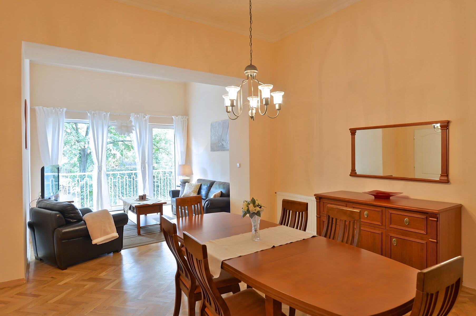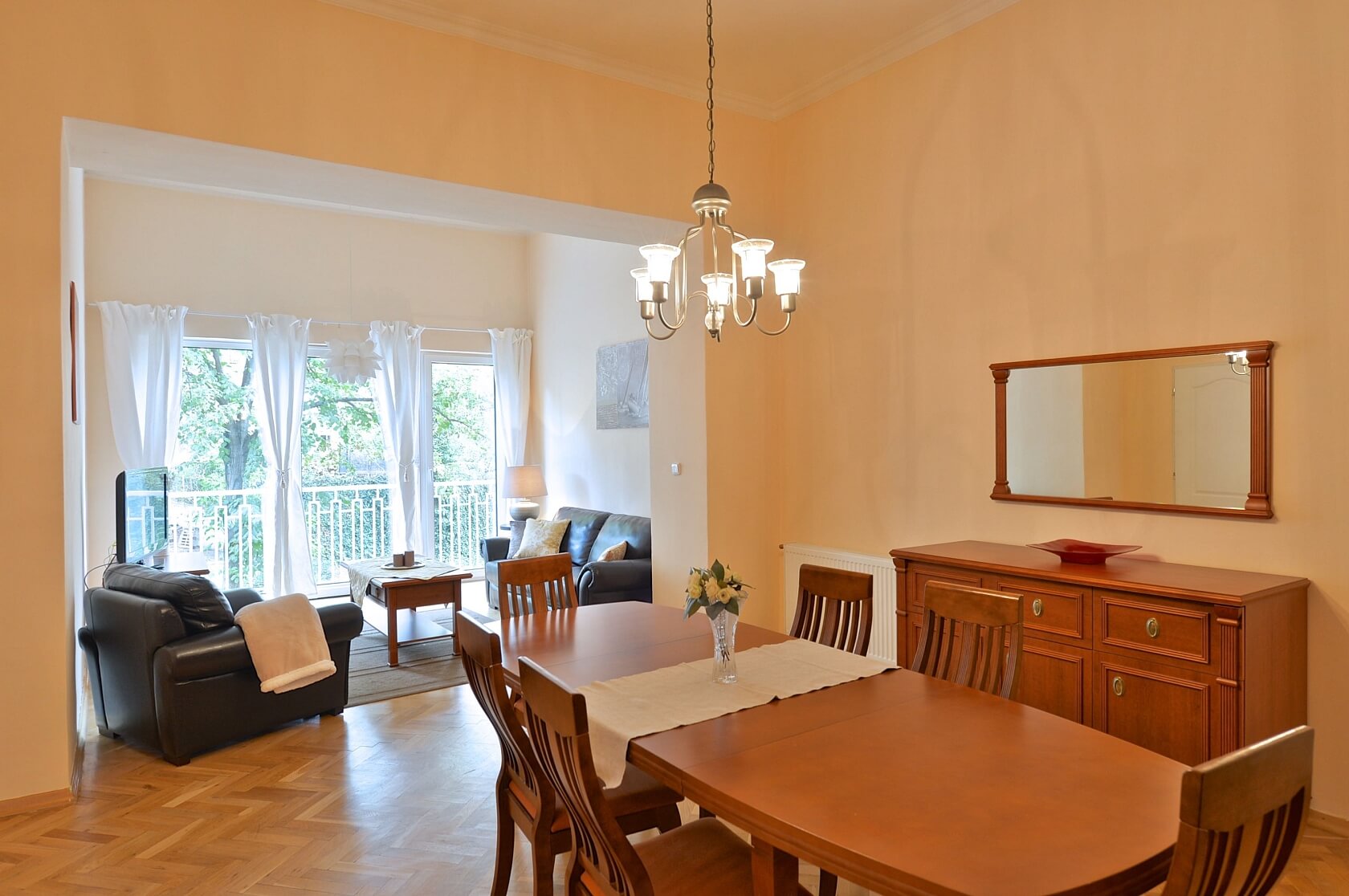 Completely furnished 2-bedroom apartment on the 1st floor of a fully reconstructed traditional building with an elevator and shared back garden. Situated on a beautiful tree-lined street in a trendy part of Vinohrady, one of the most desirable residential areas of Prague. Just a two-minute walk from the trams and metro station on Náměstí Míru and I.P. Pavlova squares, and a couple of minutes more from the city center, with the Havlíčkovy and Riegrovy Sady parks nearby. Dozens of fine restaurants, sidewalk cafes, and coffee shops in the area.