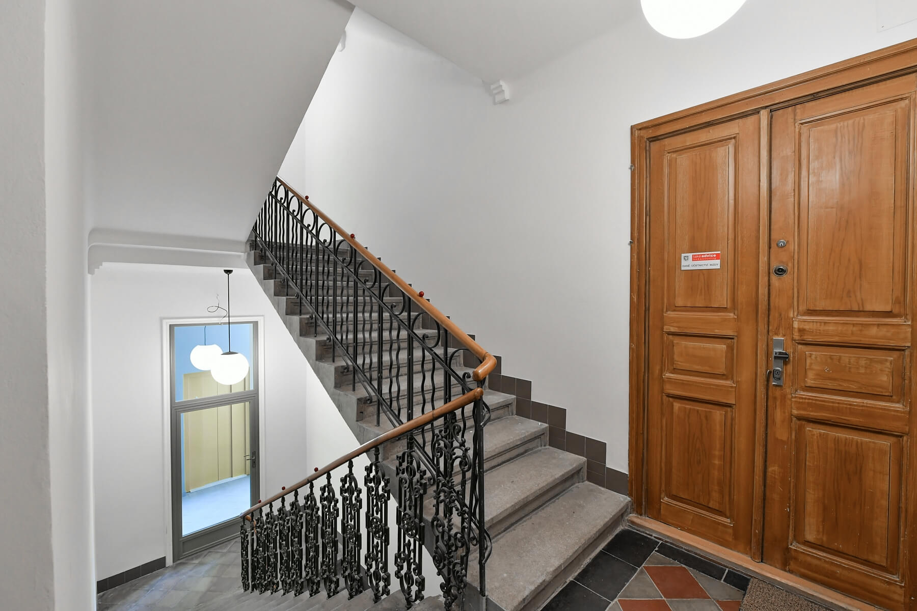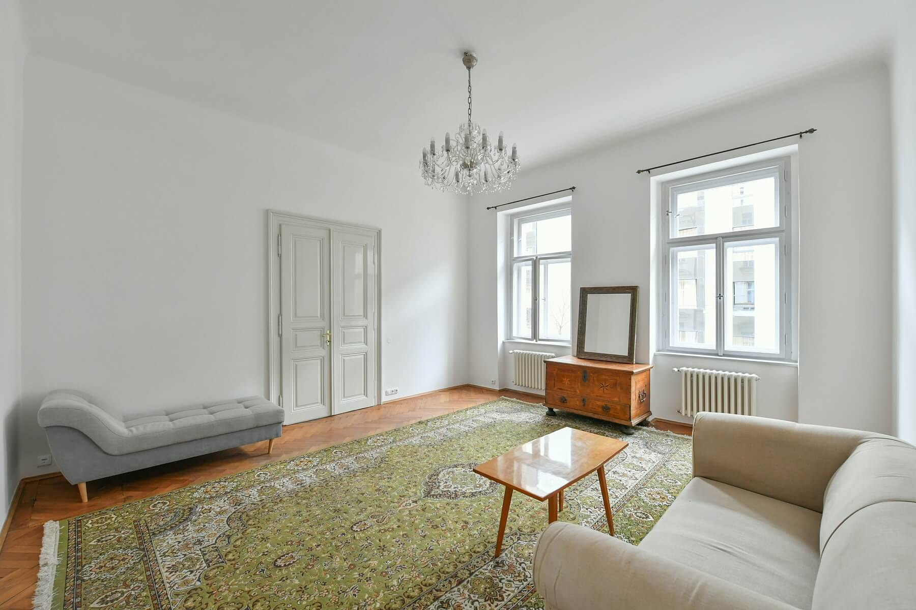 Preserved original details, high ceilings, large windows, solid wood parquet floors, tiles, gas boiler, washing machine, dishwasher, induction cooktop, microwave oven. Parking can be arranged in a nearby garage at an additional fee. Monthly deposit for service charges and water: CZK 600/person/month. Gas and electricity are billed separately (transfer to the tenant).