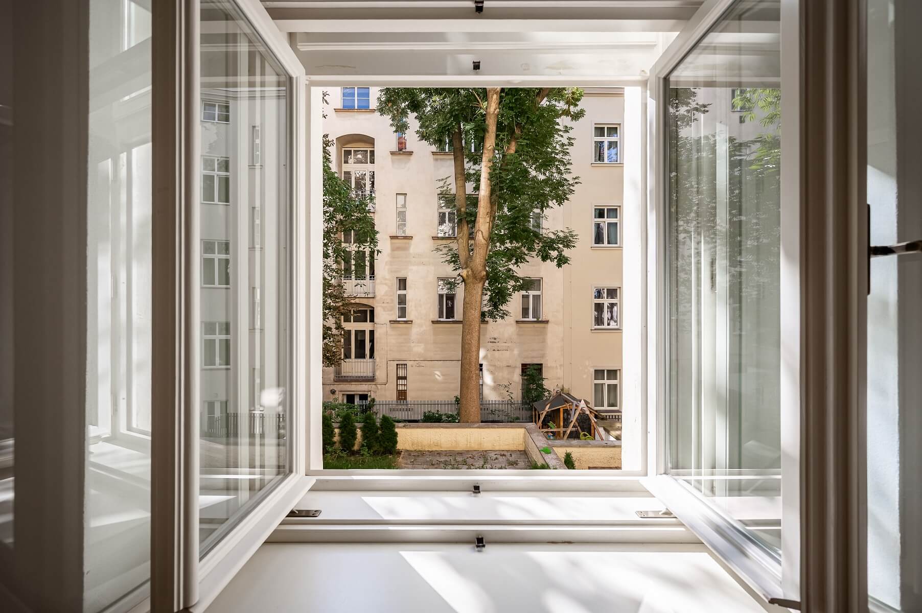 The apartment is located in a peaceful part of the prestigious Vinohrady district, right by popular Grébovka Park. The neighborhood offers plenty of cozy cafés, trendy bistros, and restaurants. The Vinohrady Theater as well as smaller theaters are also nearby. Excellent transport links to the city center are provided by trams from a nearby stop, with the Náměstí Míru metro station (line A) within easy walking distance.