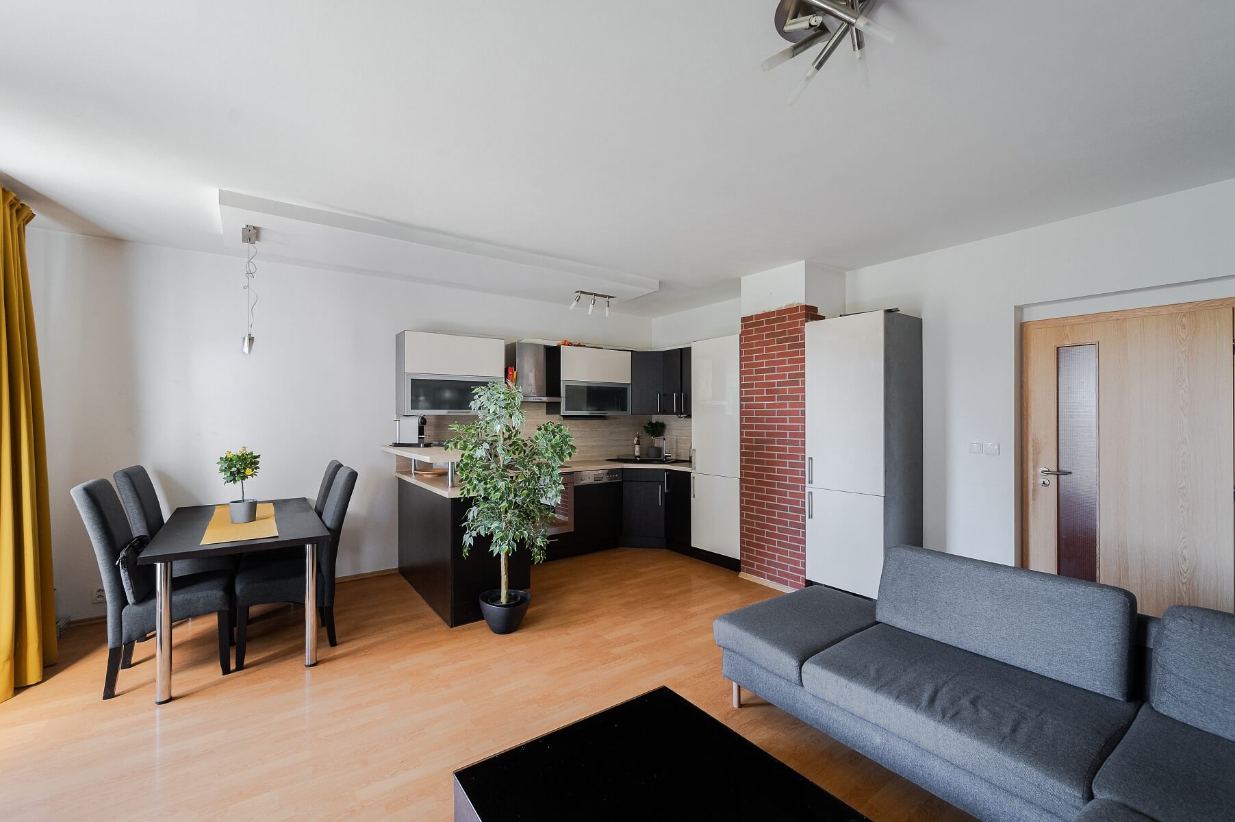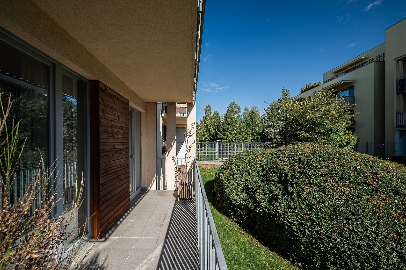 This apartment with a practical layout, a large balcony, and a garage parking space is part of a residential project consisting of smaller apartment buildings in Prague’s Čakovice district, just 25 minutes by train from the city center.