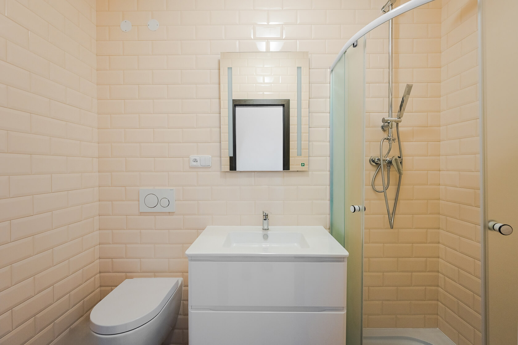 The ground-floor apartment offers a distinctive circular living space with a kitchenette, a bathroom (with a shower, sink, and toilet) and an entrance area. The unit is also suitable for use as an office.