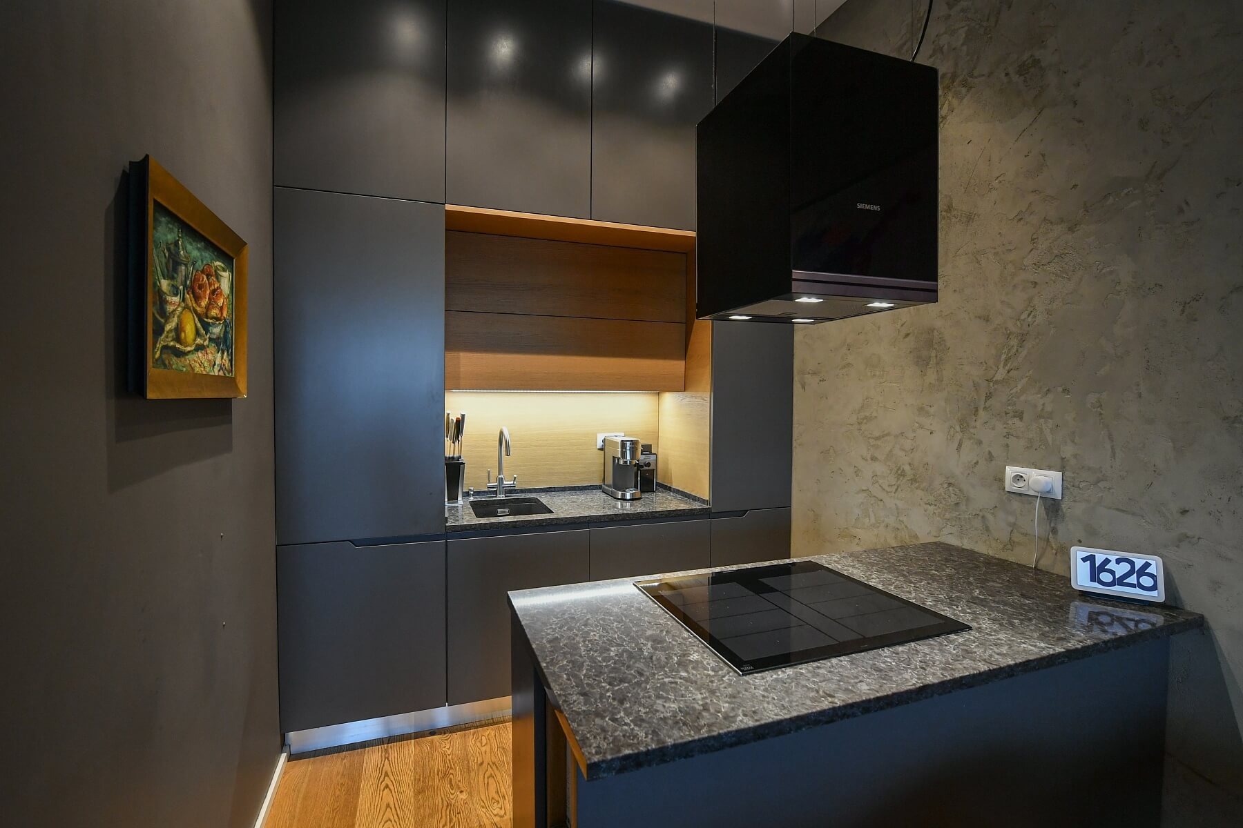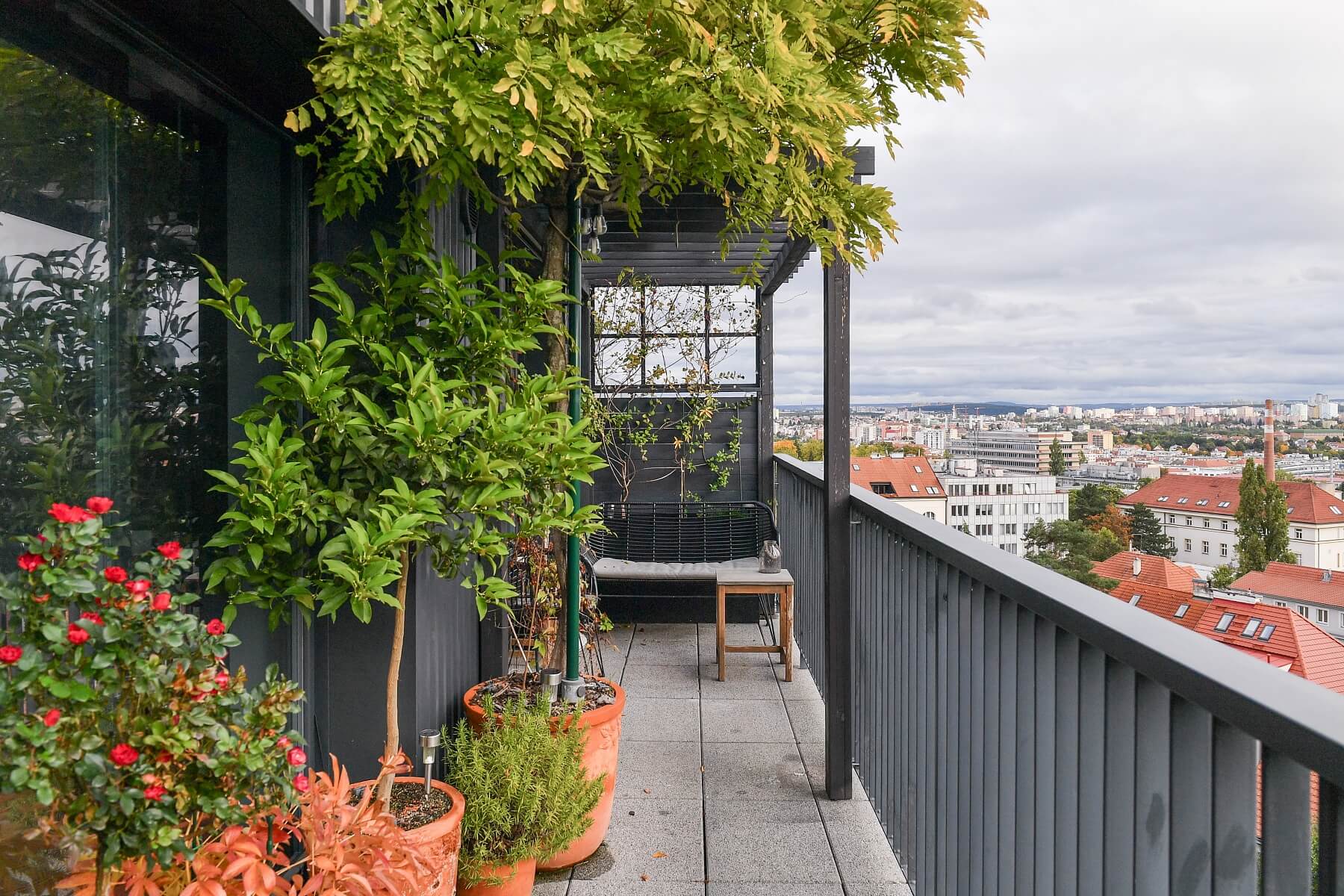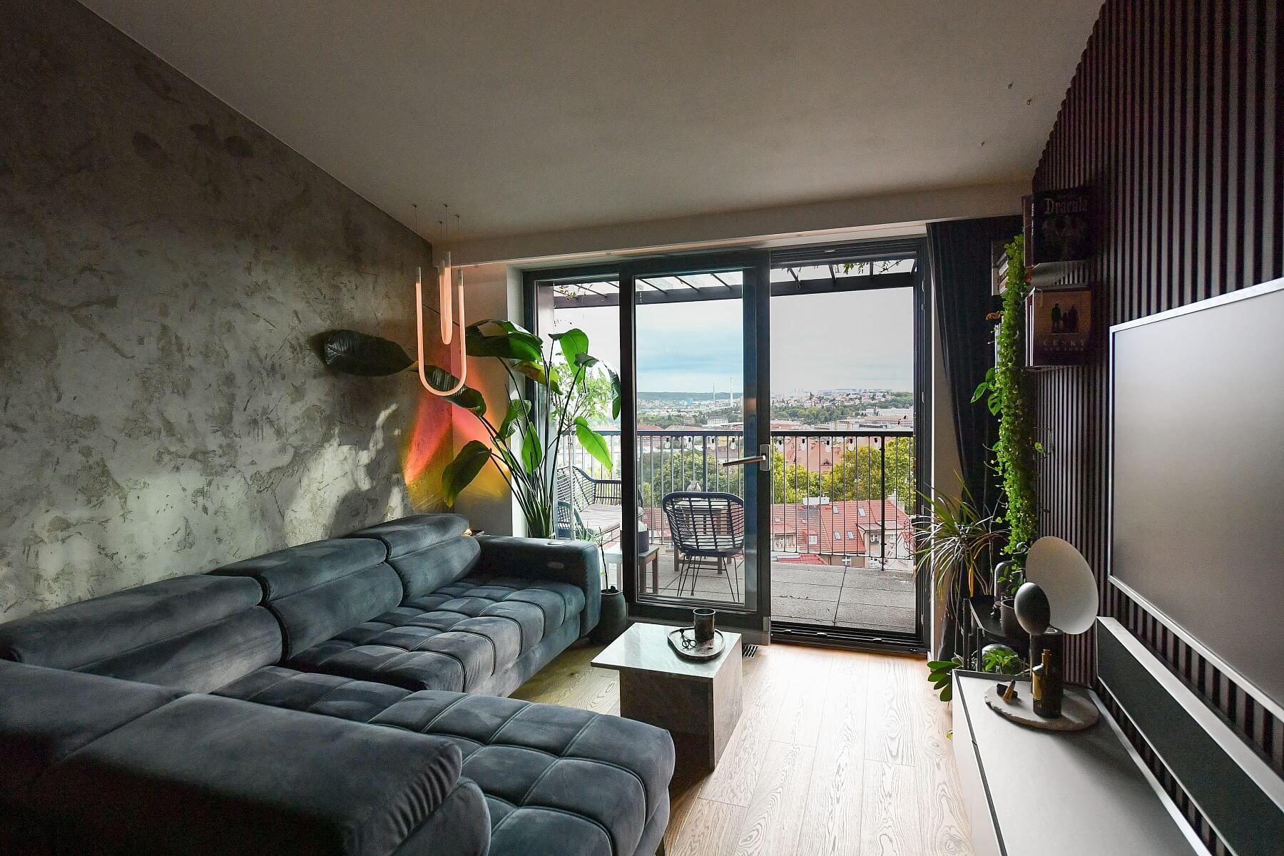 This premium, air-conditioned, and exceptionally quiet apartment with a south-facing terrace and stunning views is located on the top floor of a fully renovated residential building with an elevator in the popular Vinohrady district, just a 2-minute walk from the Želivského metro station.