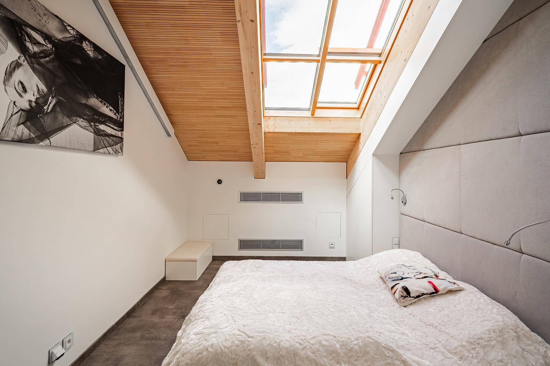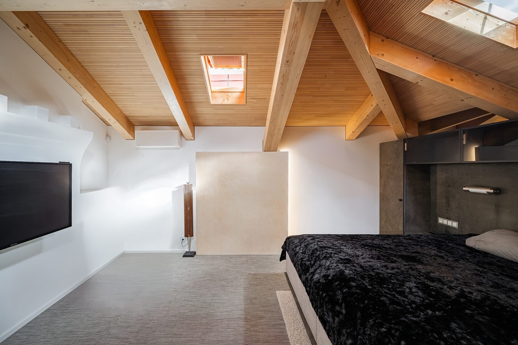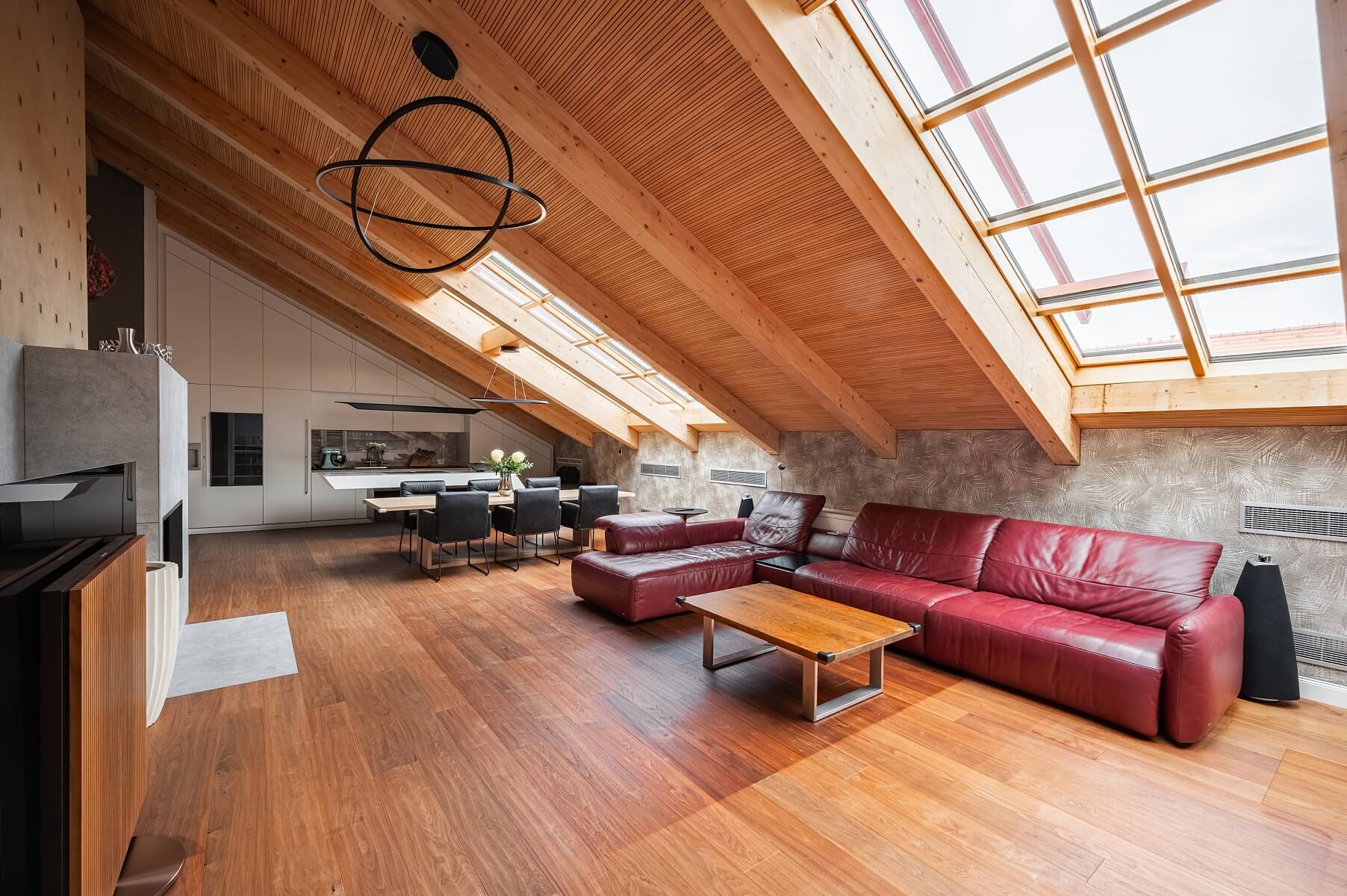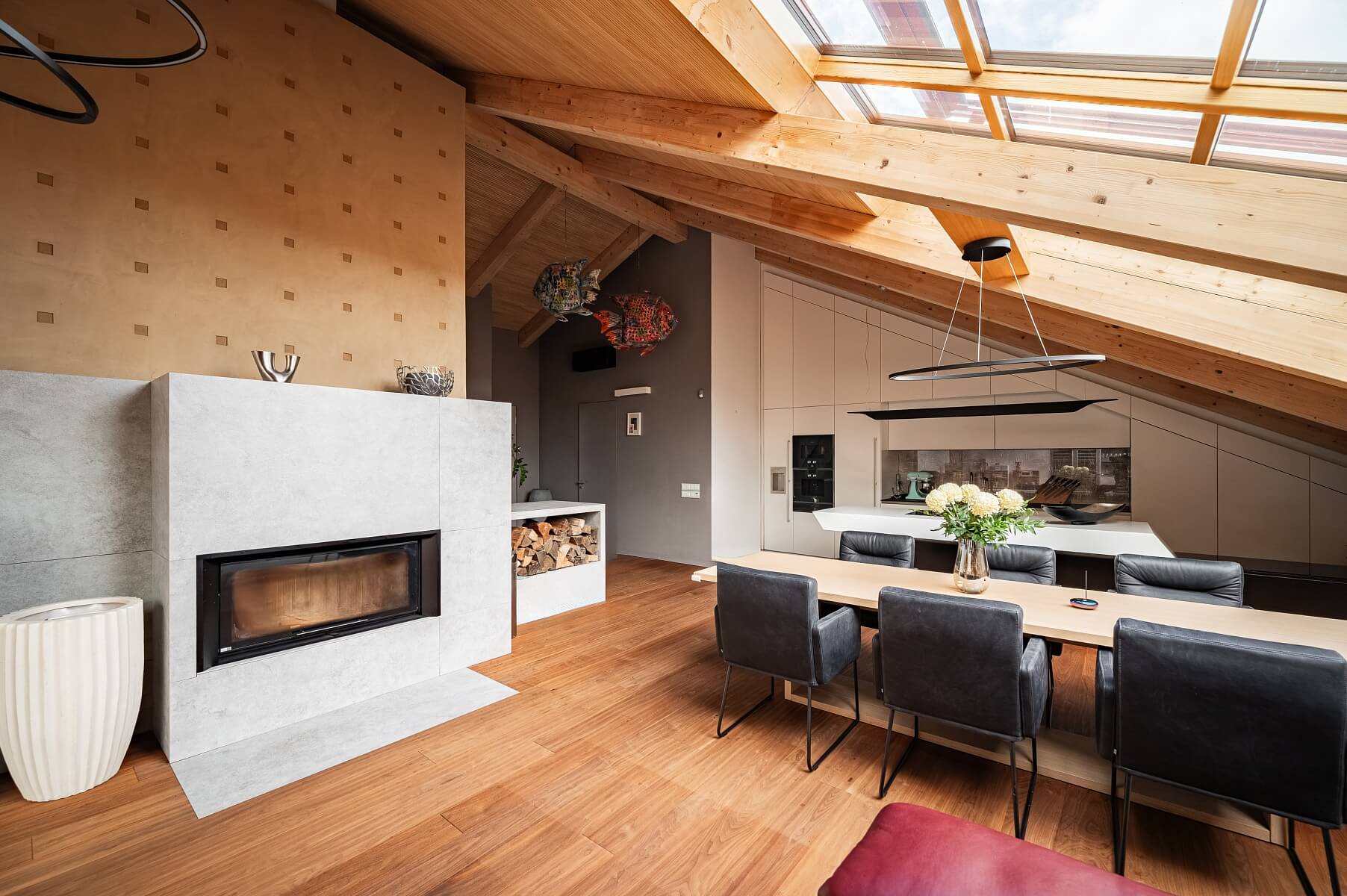 A dominant feature of the interior is the large studio-style windows set into the slanted wooden ceiling above the living area, offering panoramic views of Prague. The windows can be shaded if desired. The apartment’s premium fittings include a high-gloss Poggenpohl kitchen with Gaggenau appliances and a cooking island, a wood-burning fireplace, custom-made built-in furniture, and a smart home system that enables remote control of underfloor heating, air-conditioning, lighting, external blinds, security, and household appliances.