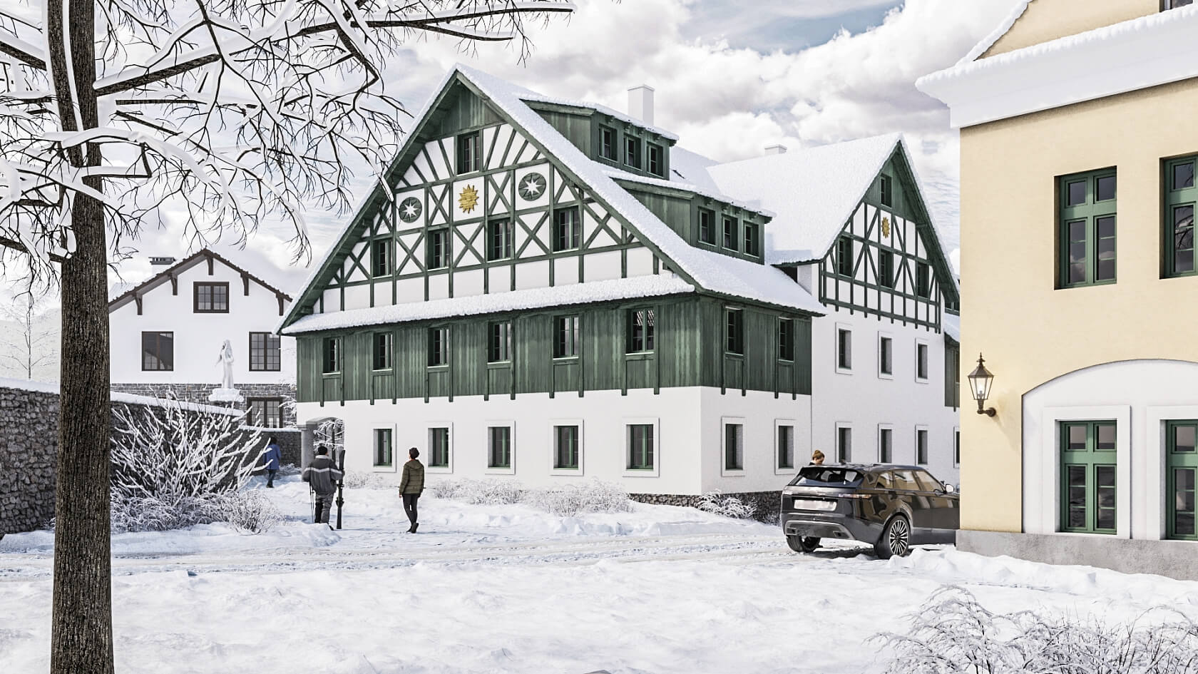 The developing town of Boží Dar is surrounded by the picturesque Krušné Mountains, providing a unique setting for year-round living. The area offers over 120 kilometers of maintained cross-country skiing trails, seamlessly connecting to additional routes, including the Krušnohorská Magistrála. Experienced downhill skiers will appreciate the Neklid ski area with its groomed snowpark and nearby Klínovec, while families with children can enjoy two smaller ski areas right in Boží Dar. Outside the winter season, visitors are drawn to the region’s abundant nature and wide range of leisure time activities. Popular destinations include the Novako adventure area, Boží vyhlídka viewpoint, Boží Trail, and Ježíškova path, which features two circuits with various play elements. In the town center, amenities include the popular Červený Vlk brewery, a café, grocery store, local history museum, tourist information center, and several restaurants. The renowned spa towns of Jáchymov and Karlovy Vary, offering rich cultural and wellness experiences, are within a short drive.