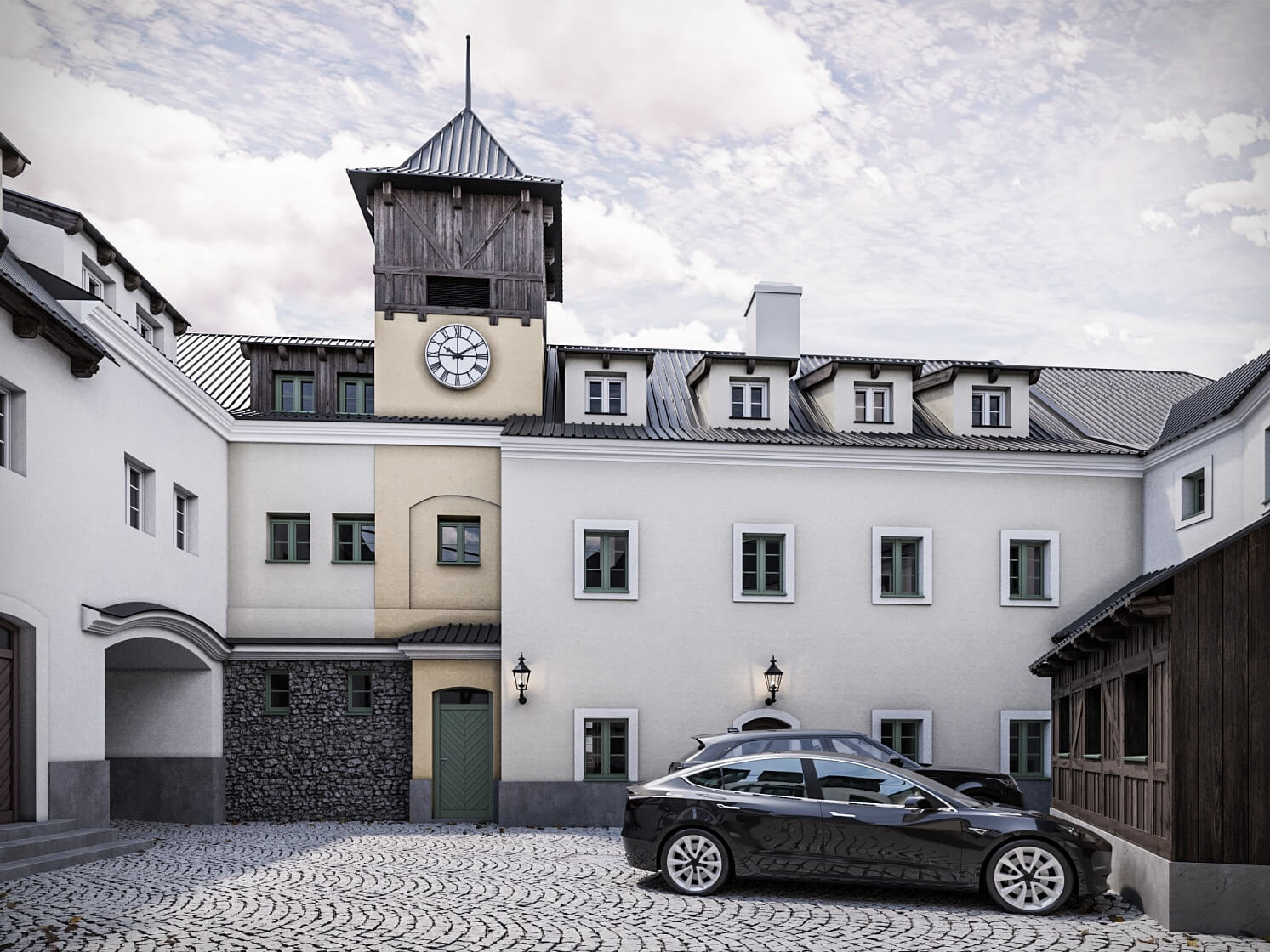 The apartment is offered for sale in a white walls condition, allowing the future owners to tailor the layout entirely to their individual needs. The architectural concept proposes a spacious living area combining an open plan living, dining, and kitchen space, a bedroom, and a bathroom. The elevator provides direct access from the garage to the apartment, ensuring barrier-free entry.