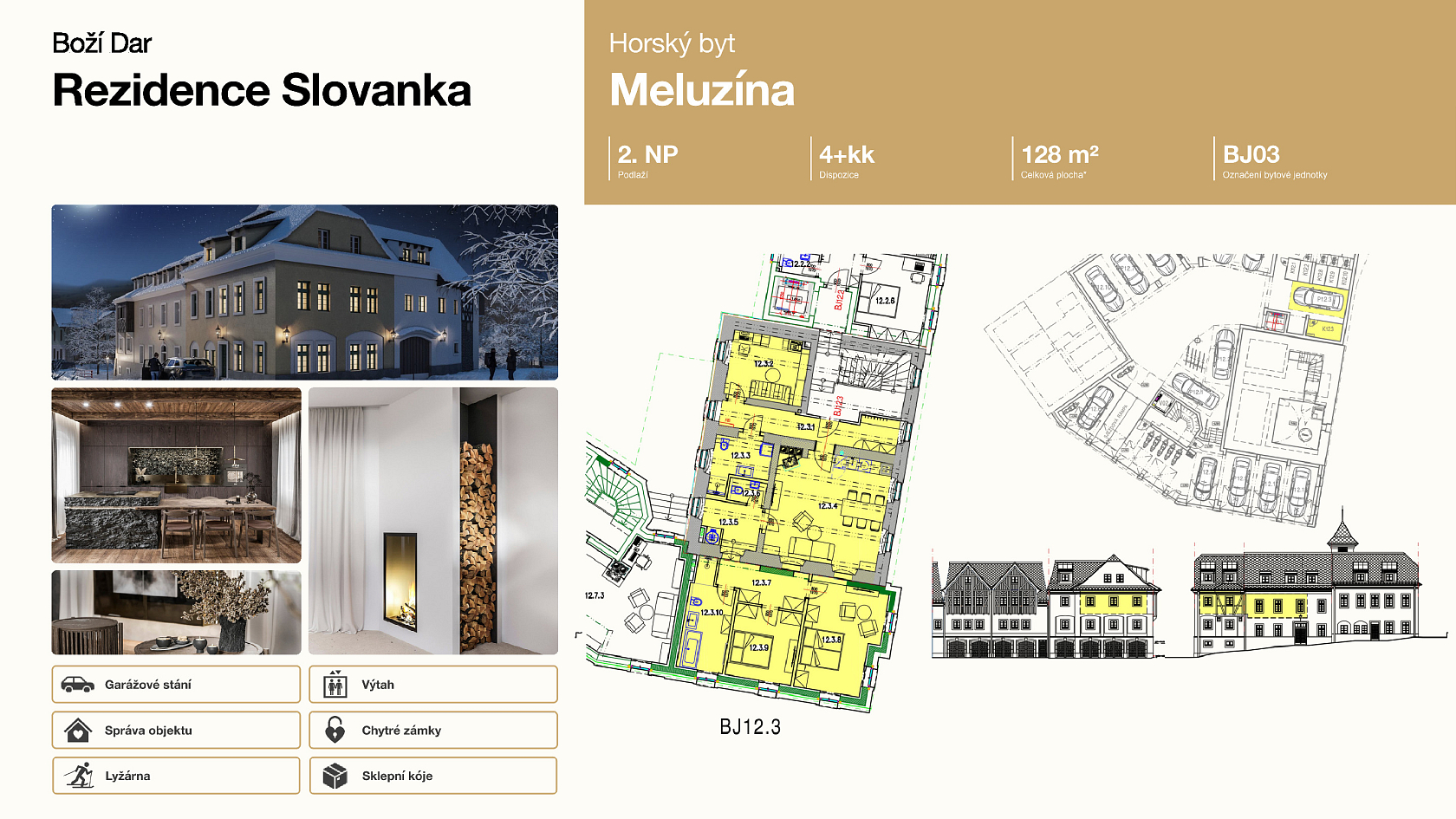This spacious apartment spanning an 128 m² on the 1st floor of the new Slovanka Residence, located directly in the center of Boží Dar, offers exceptional facilities for recreational use or year-round living in the heart of the beautiful Krušné Mountains countryside. The price includes a garage parking space and a cellar storage unit.