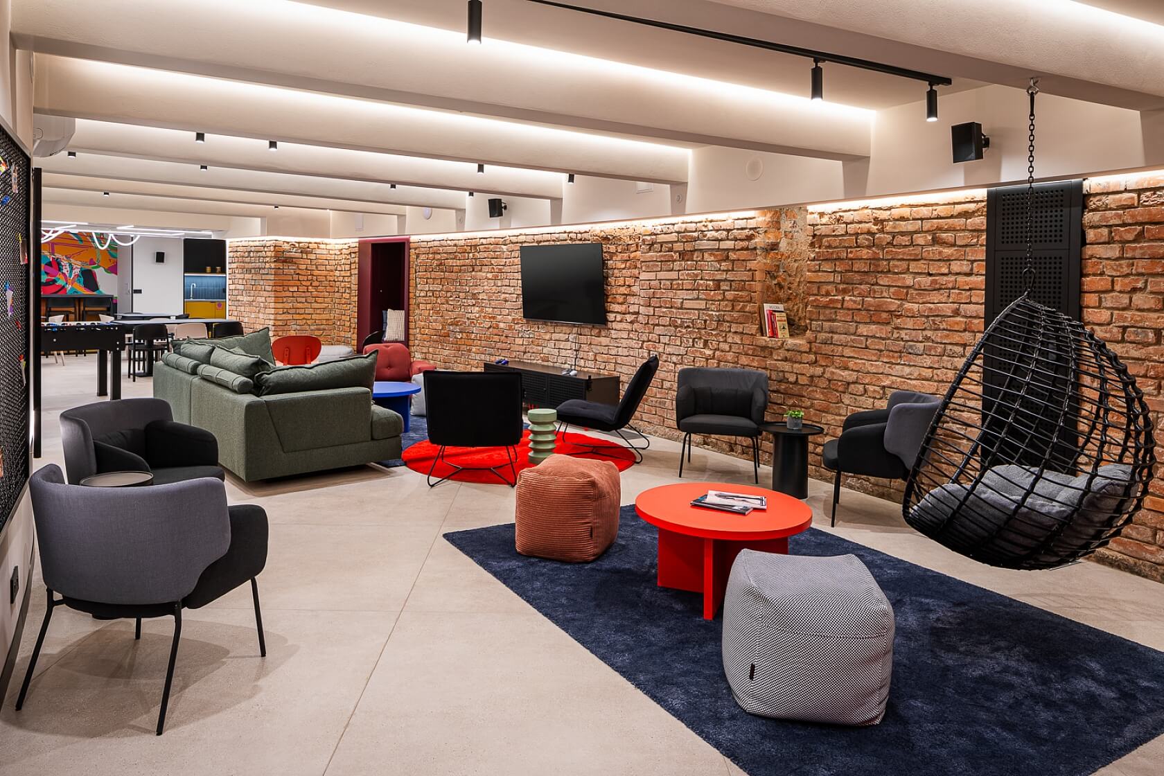 The unit is offered fully furnished. The living room features a sofa bed suitable for everyday sleeping, a desk with a chair, and a wardrobe. The kitchenette is equipped with a sink with a tap, cooktop, extractor hood, refrigerator, microwave, as well as details such as a waste bin. The entrance hall includes a coat rack and a mirror. The windows are fitted with curtains and day-and-night blinds, and heating is provided by a central gas boiler system. Residents have access to shared coliving spaces in the basement, including a common room and kitchen for hosting events and gatherings, a podcast studio, sauna, and fitness area. These facilities are currently fully operational; their future use and management will depend on a joint decision of the unit owners.