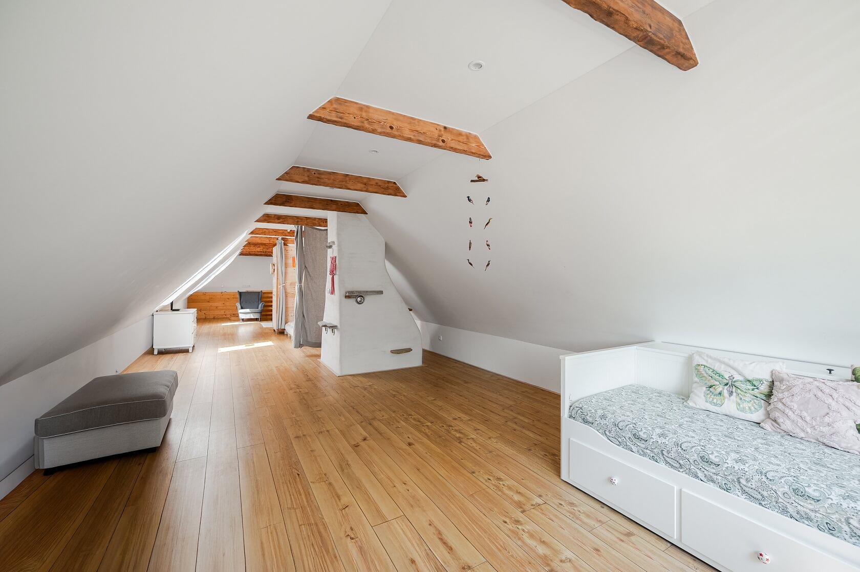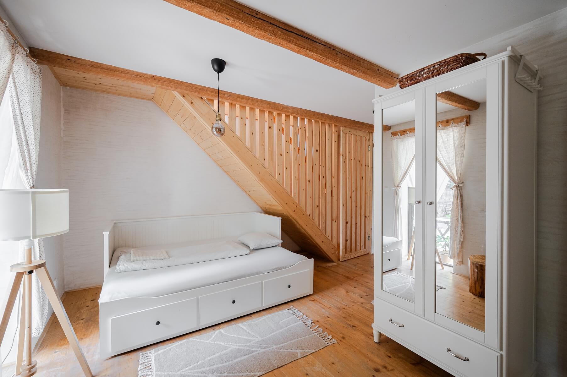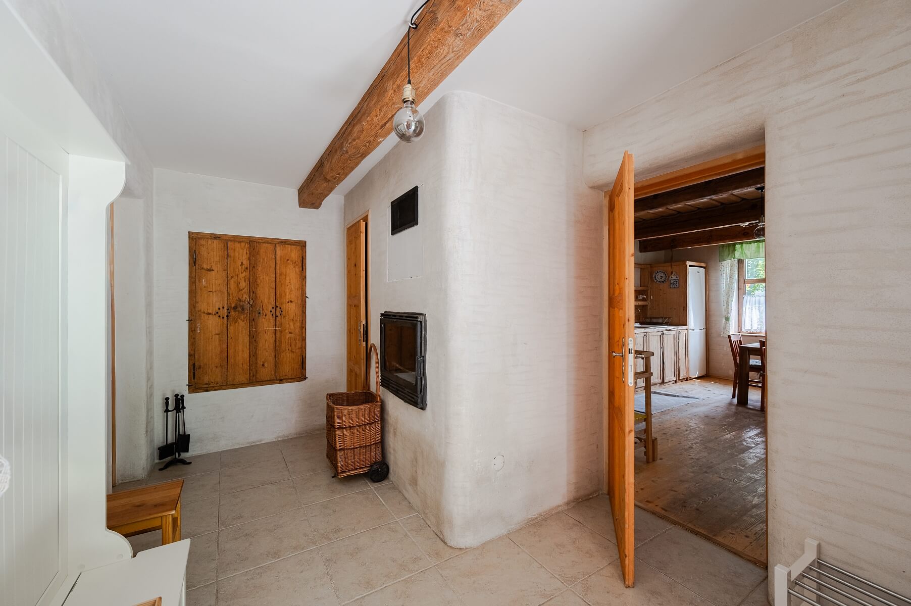 The interior is dominated by wooden furniture, doors, and windows, exposed ceiling beams, stone, and pristine white walls, completing the character of a classic house from the early 20th century. The custom-made kitchen from century-old planks is complemented by wooden flooring laid in the living room as well. Heat is distributed by a fireplace insert, while an electric boiler ensures tempering in case of extended absence. Municipal drinking water is purified by an in-house filtration system, a new wastewater treatment plant has been installed, and the property also features a well with ample groundwater. The standalone barn offers an interesting opportunity to expand the living space, for example, into a leisure zone or guest rooms. With its south and southeast orientation, it is also suitable for installing photovoltaic panels.