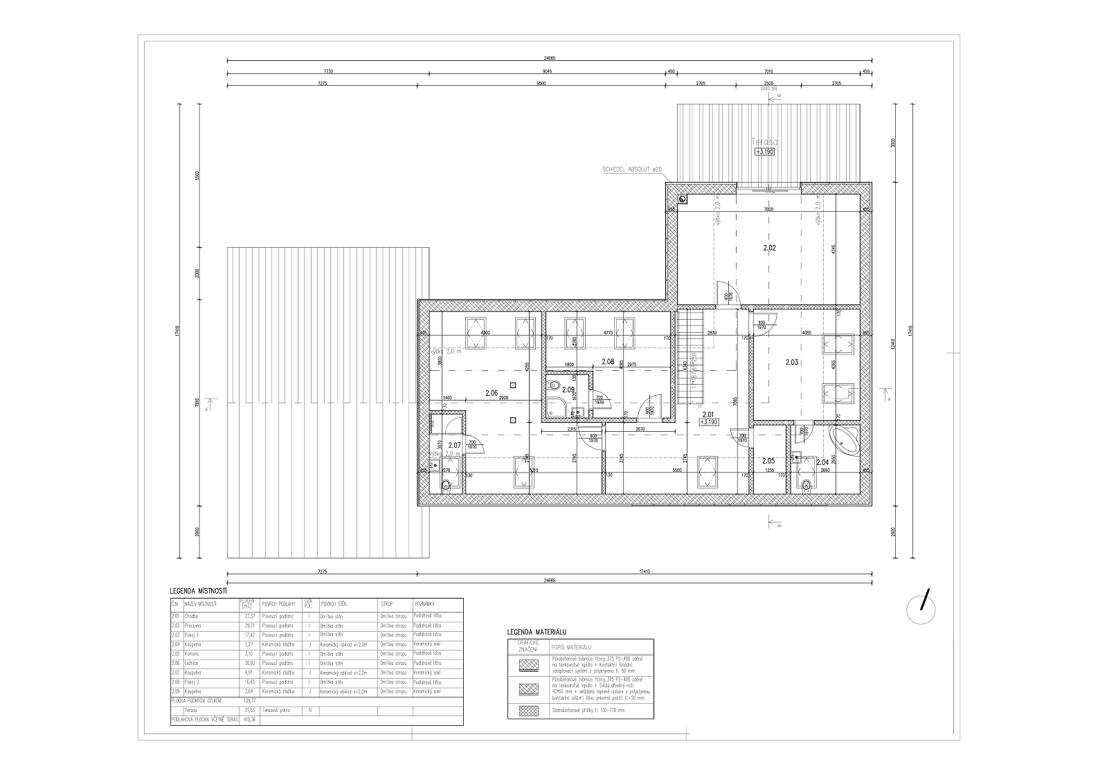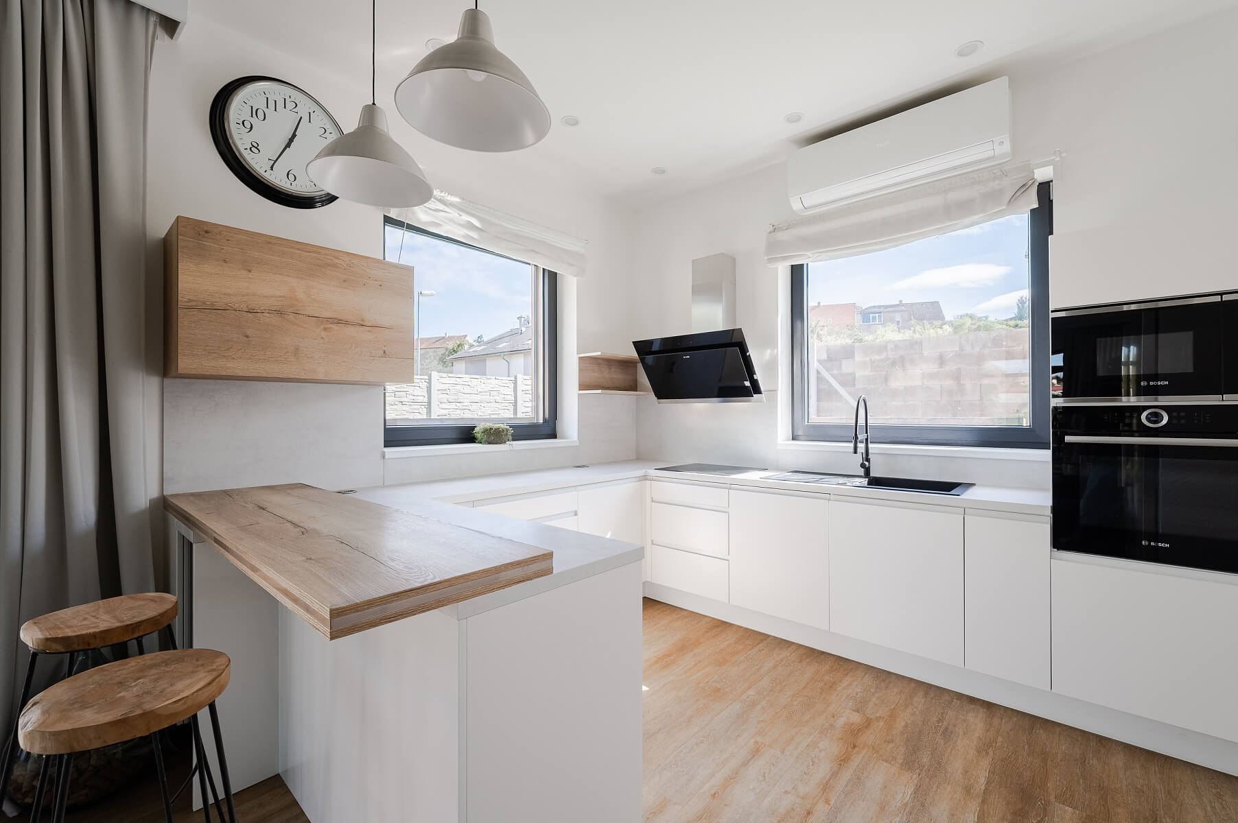 The airy interior is enhanced by 3.2-meter-high ceilings. Floors are durable vinyl, with Veka plastic windows featuring argon-filled double glazing, a seven-chamber frame system, and external blinds. The front door is security-rated, and interior doors are from the ANTINARI Czech manufacturer. The house comes equipped with built-in furniture and a custom SYKORA kitchen with high-quality BOSCH appliances, including a wine cooler and American-style fridge. Bathrooms feature Villeroy & Boch fixtures, with underfloor heating throughout, and a Jablotron camera security system. Heating is provided by a BAXI gas boiler with the option of additional wood stove heating, and the pool is heated via a heat pump. Air-conditioning is installed in all living areas. The facade is clad in Siberian larch, and wastewater is connected to the municipal sewer. The outdoor saltwater pool measures 7.5 × 3 m and can be covered with an electric, walkable, sliding terrace made of Siberian larch.