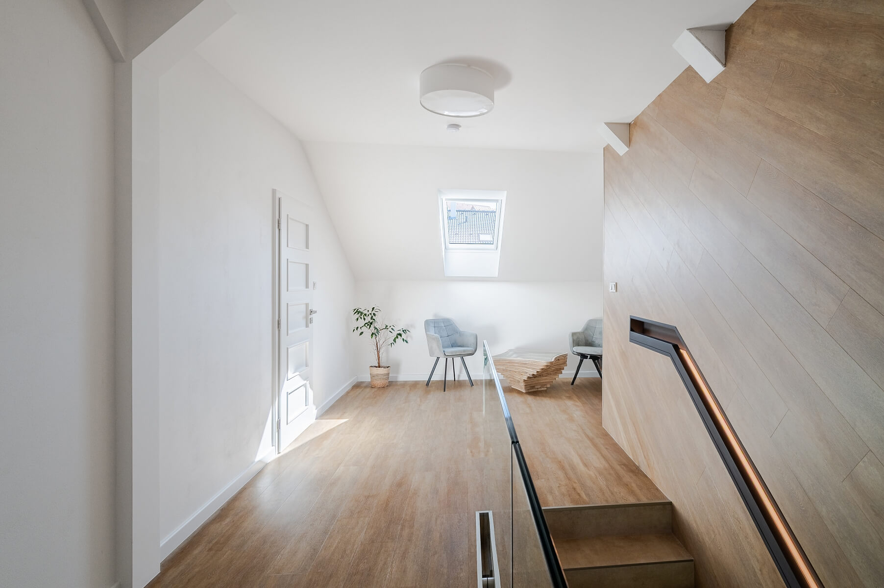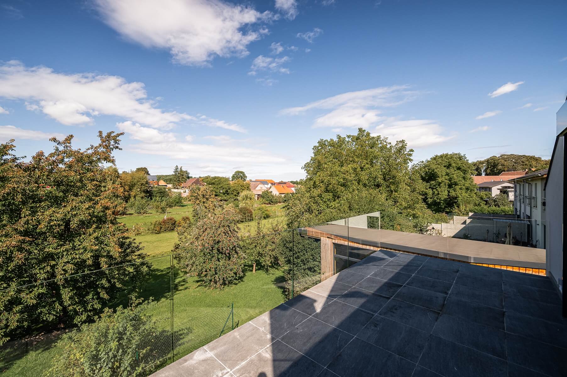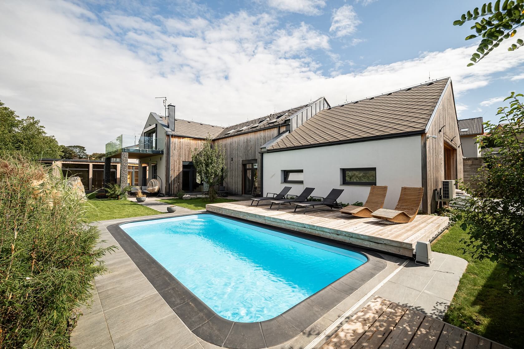This modern family house with a heated swimming pool and landscaped garden, built in 2022, is located on a quiet cul-de-sac in the Central Bohemian village of Hostouň, which benefits from its convenient location near the Václav Havel Airport and D6 and D7 highways.