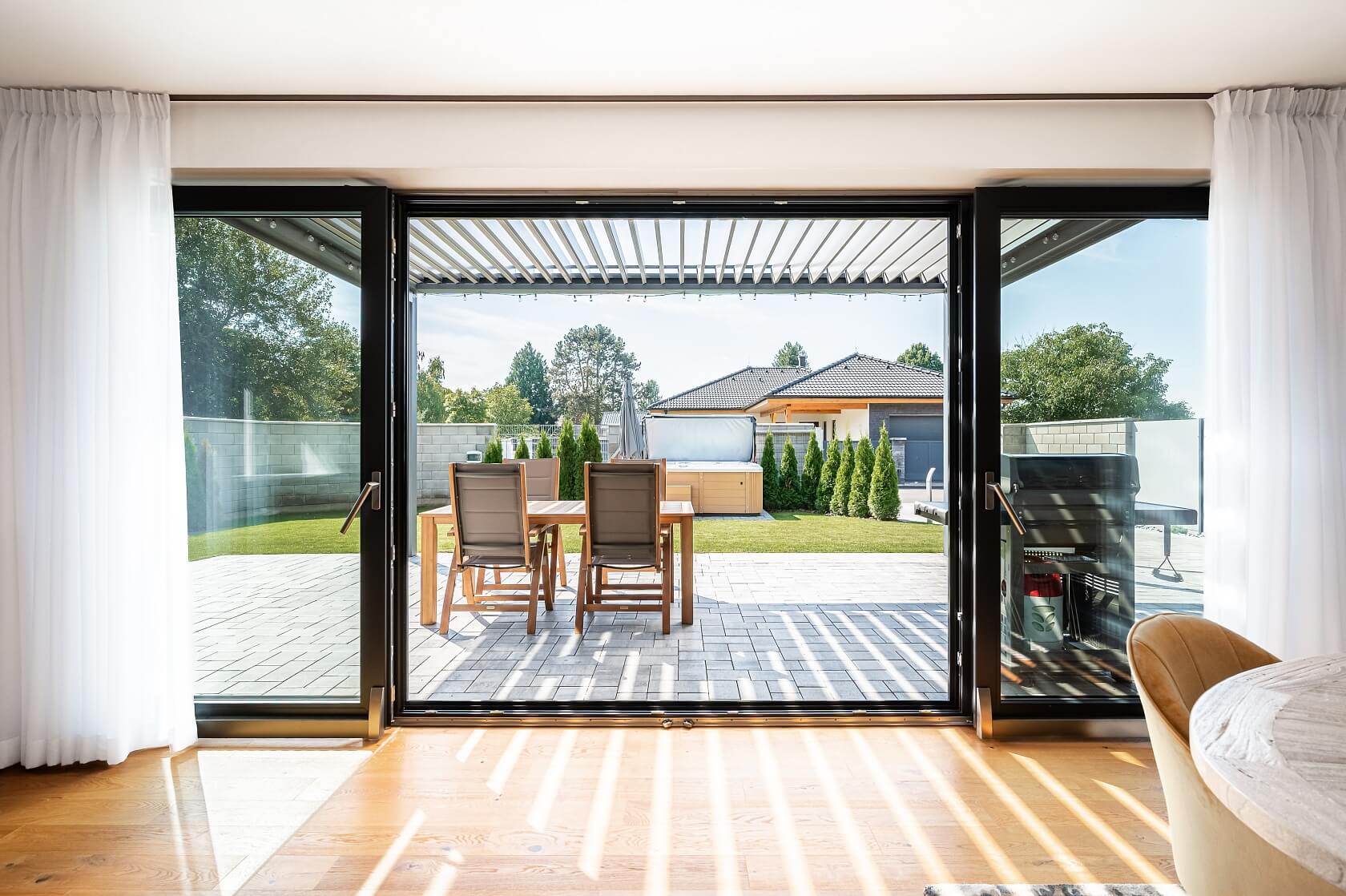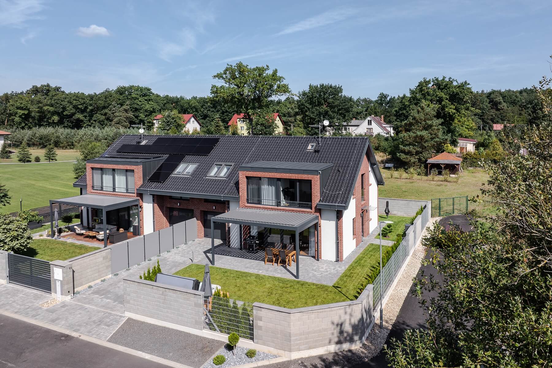 The brick house (a semi-detached unit) was completed and certified in December 2022. High-quality features include large-format triple-glazed windows with insect screens and external electric blinds with central control, roof windows with blinds, glued wooden floors, air-conditioning in all rooms, a custom-made kitchen with Siemens appliances, a central vacuum system, a water softener, a security system, flush doors, and underfloor heating connected to a heat pump. The terrace is shaded by a bioclimatic pergola with an electrically controlled roof and side shading. Parking is provided in a garage equipped with a wallbox for charging electric vehicles, with direct access to a flat garden, which is low-maintenance due to its size and plant selection. The garden is irrigated by an automatic system with a rainwater retention tank, and a Canadian Spa hot tub is located near the pergola.