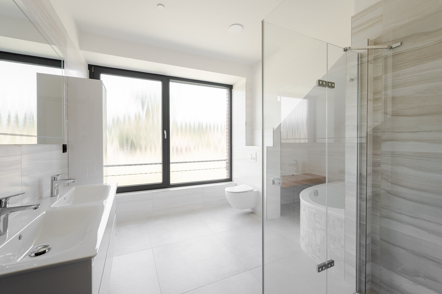 The ground floor is dominated by an over 50-meter living space connected by a glass wall with a southwest-facing terrace. There is also a dressing room, a storage room, a toilet, a utility room, and a foyer. The quiet zone on the first floor consists of 4 bedrooms, (two with custom-built walk-in closets), a spacious and airy bathroom with a corner bathtub, walk-in shower, double sink, and toilet, as well as a separate WC. The walkable attic provides ample storage space.