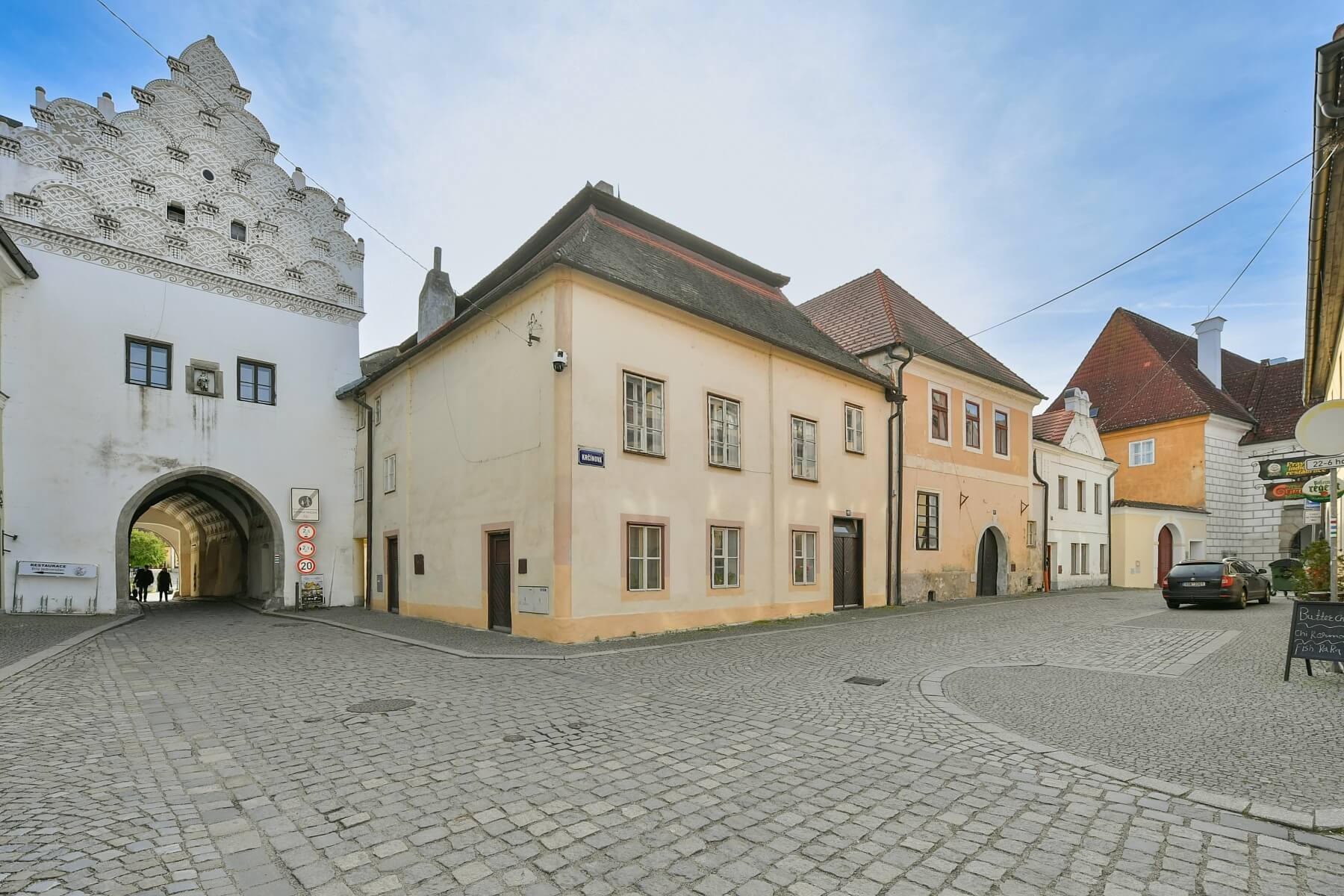 A pair of adjacent historic buildings with a rich past and a valid building permit for conversion into an apartment house (an extension has been applied for) are located in the historic center of Třeboň, close to the castle park and the main square. The buildings of the former synagogue and school—the latter listed as an immovable cultural monument—represent significant architectural value and form an important part of the historic fabric of this renowned spa town.