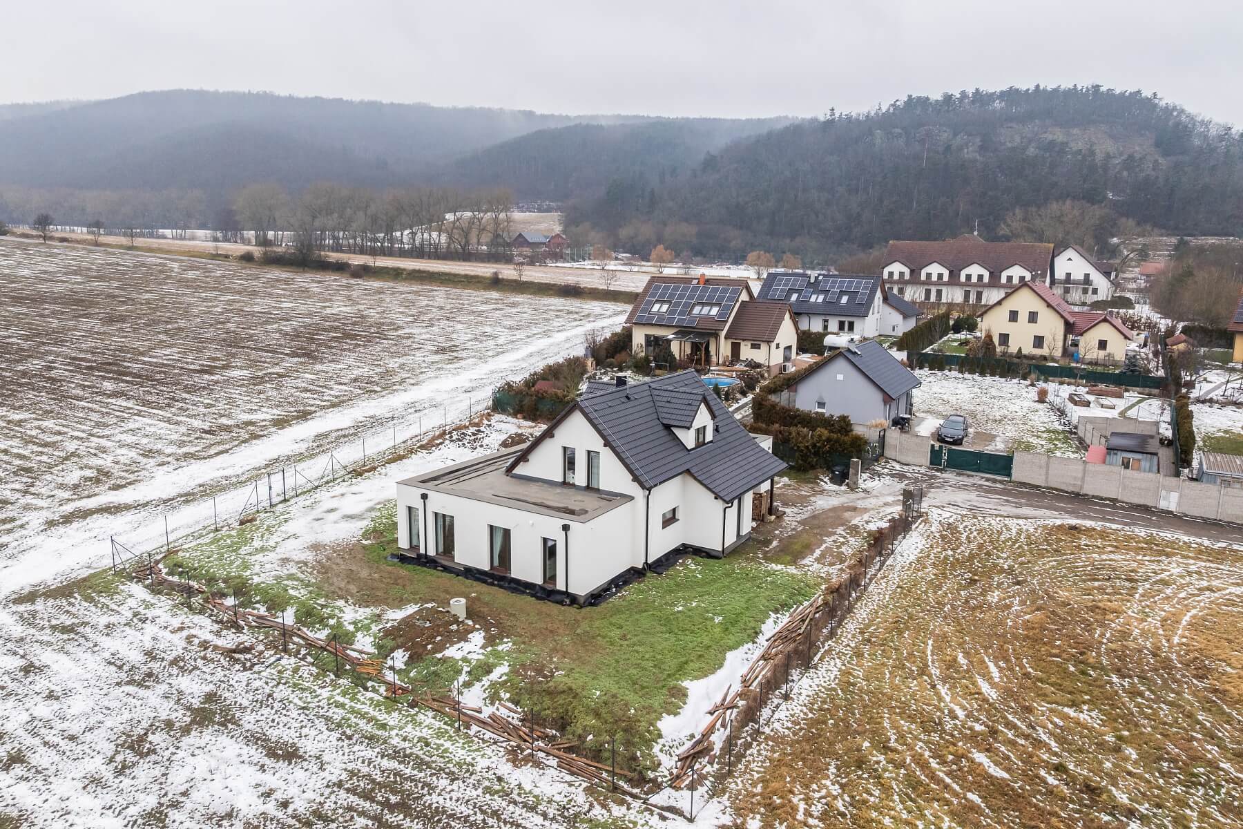 The insulated brick house, approved for use in 2022, meets the most energy-efficient class A standard. Underfloor heating runs beneath the vinyl floorr throughout the property, large-format windows are fitted with exterior blinds, and the infrastructure is prepared for the installation of air-conditioning. Security is ensured by a Jablotron camera and alarm system. An extensive study with a layout and planting plan has already been completed for the garden.