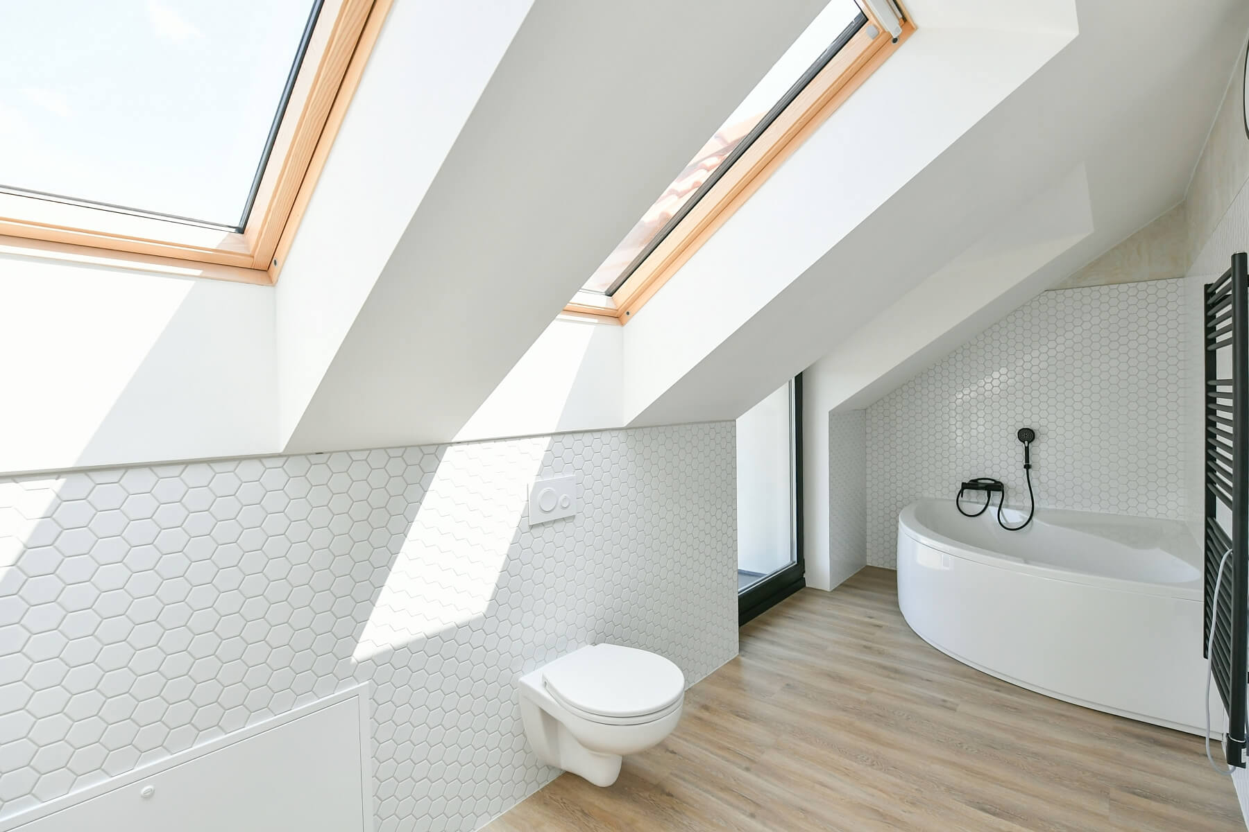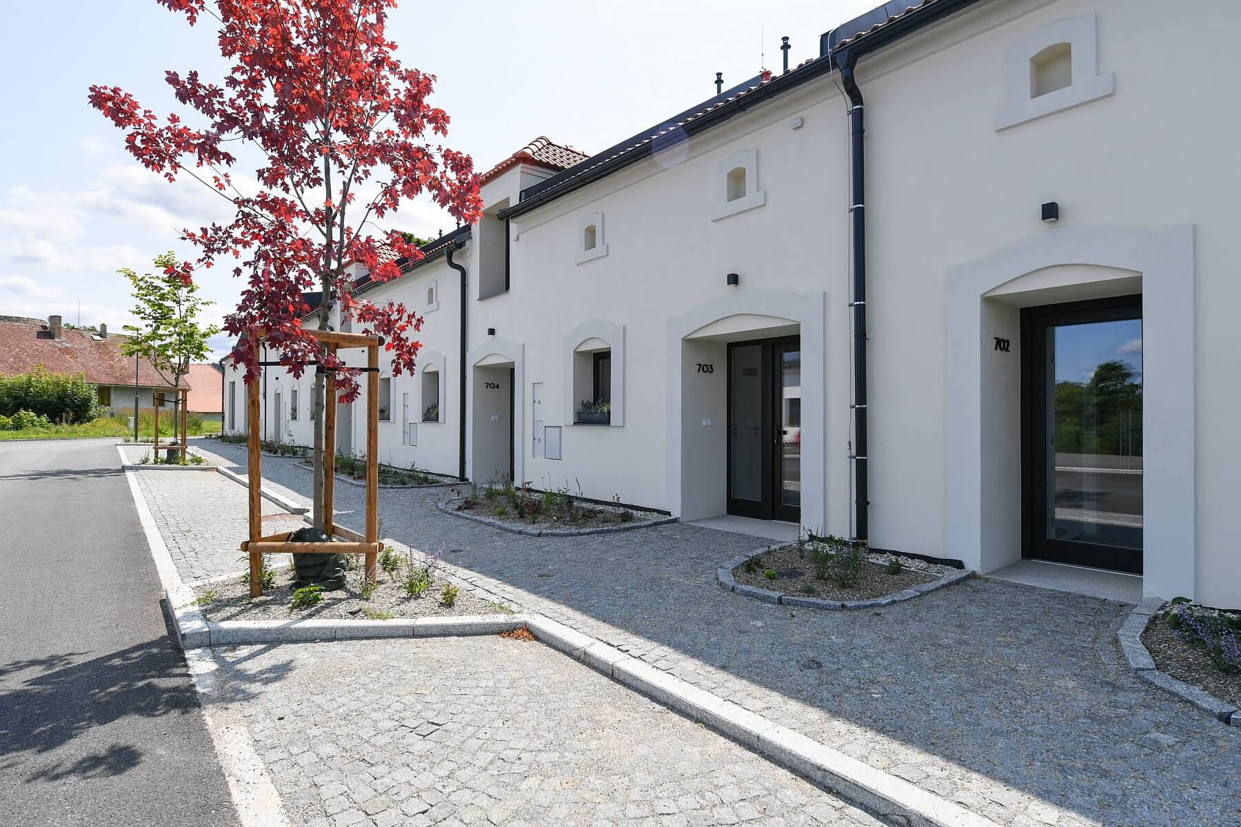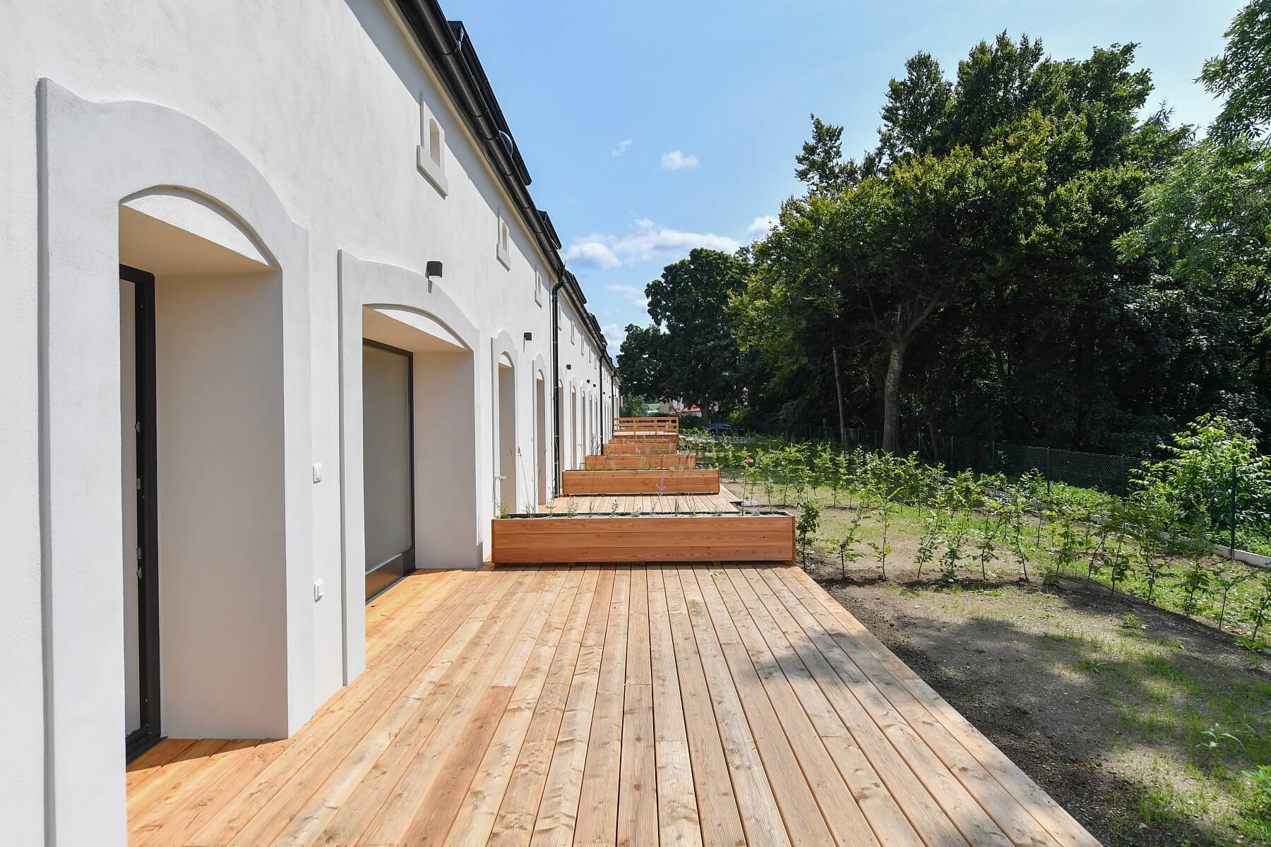 The largest house will feature a 5-bedroom layout with an open plan kitchen (6+kk), while the remaining houses will have 2-bedroom or 3-bedroom layouts, ranging in size from 90 m2 to 197 m2. Facilities include Velux skylights with triple glazing, wooden triple-glazed windows with black frames on the ground floor (one house will have aluminum windows), a chimney prep for fireplaces, vinyl floors, underfloor heating with separate zones for each room, air-conditioning in larger houses, gas boilers, and the option for solar panels. Each garden will feature a larch wood terrace and a water connection. Sound insulation between units will be enhanced. All houses come with exclusive use of two or three outdoor parking spaces (one prepped for EV charging) and a southwest-facing garden bordering the castle’s game preserve.