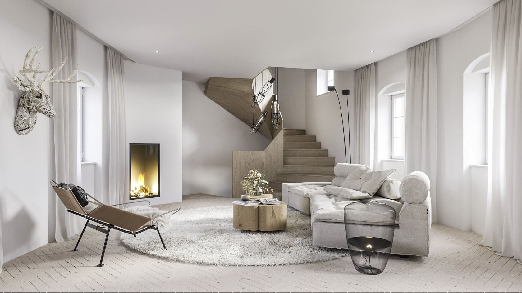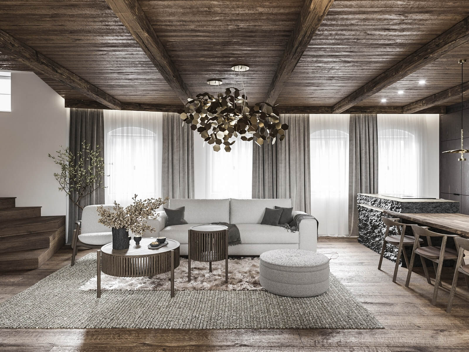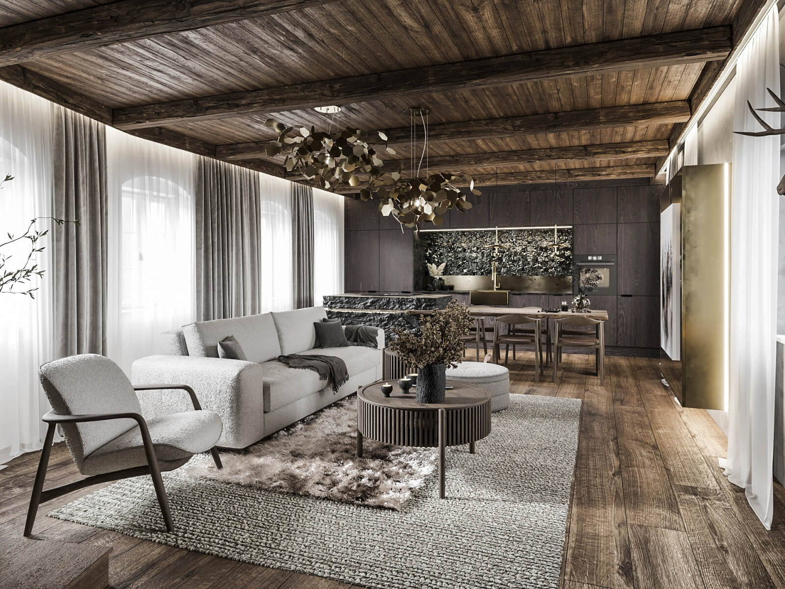 Slovanka consists of two connected buildings, whose architectural design sensitively respects the historical appearance of the original structures. The roof dormers, the period combination of plaster and vertical wooden cladding with hints of half-timbering in the gables, and the characteristic window layout have been preserved, allowing the project to naturally blend into the surrounding buildings in the center of Boží Dar. Thirteen mountain apartments, including five luxury duplexes, are now being completed on three above-ground floors, interconnected by staircases and an elevator. The first basement floor houses parking spaces, cellar cubicles for storing sports equipment, and a shared ski storage room.