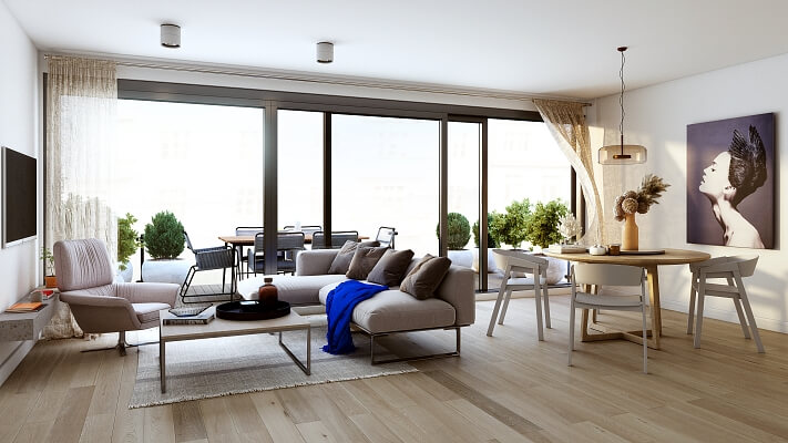 The apartments will have layouts ranging from 2-bedroom to 4-bedroom and floor areas from 41 sq. m. to 140.5 sq. m. Some of the apartments will have a balcony or spacious terrace, each apartment comes with a closet. Standard facilities will include laminate flooring, high-quality wall tiles, floor tiles, interior doors, Standard Ideal sanitary ware, and plastic windows and doors with insulated triple-glazed panes. Underfloor heating from the central boiler room located in the building as well as a heated towel rail in the bathrooms are also planned. The apartments will be air-conditioned. Chip-entry aluminum entrance door. It will be possible to buy a parking space in the garage for EUR 25,000 (incl. VAT).